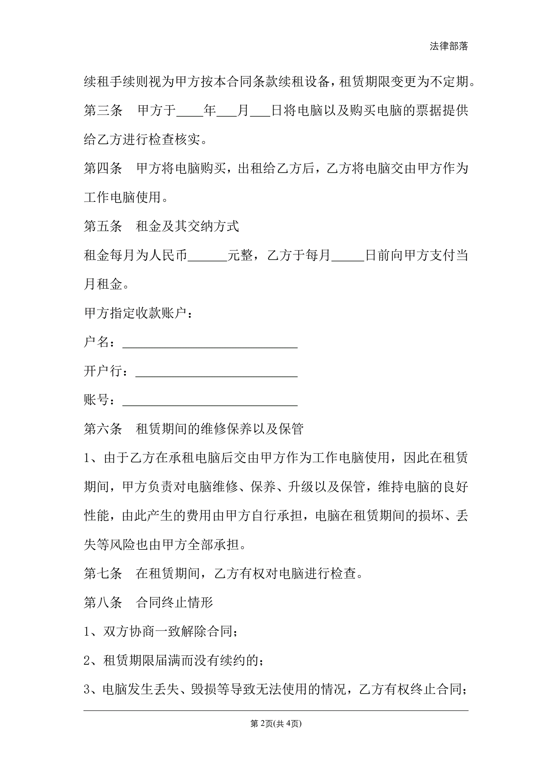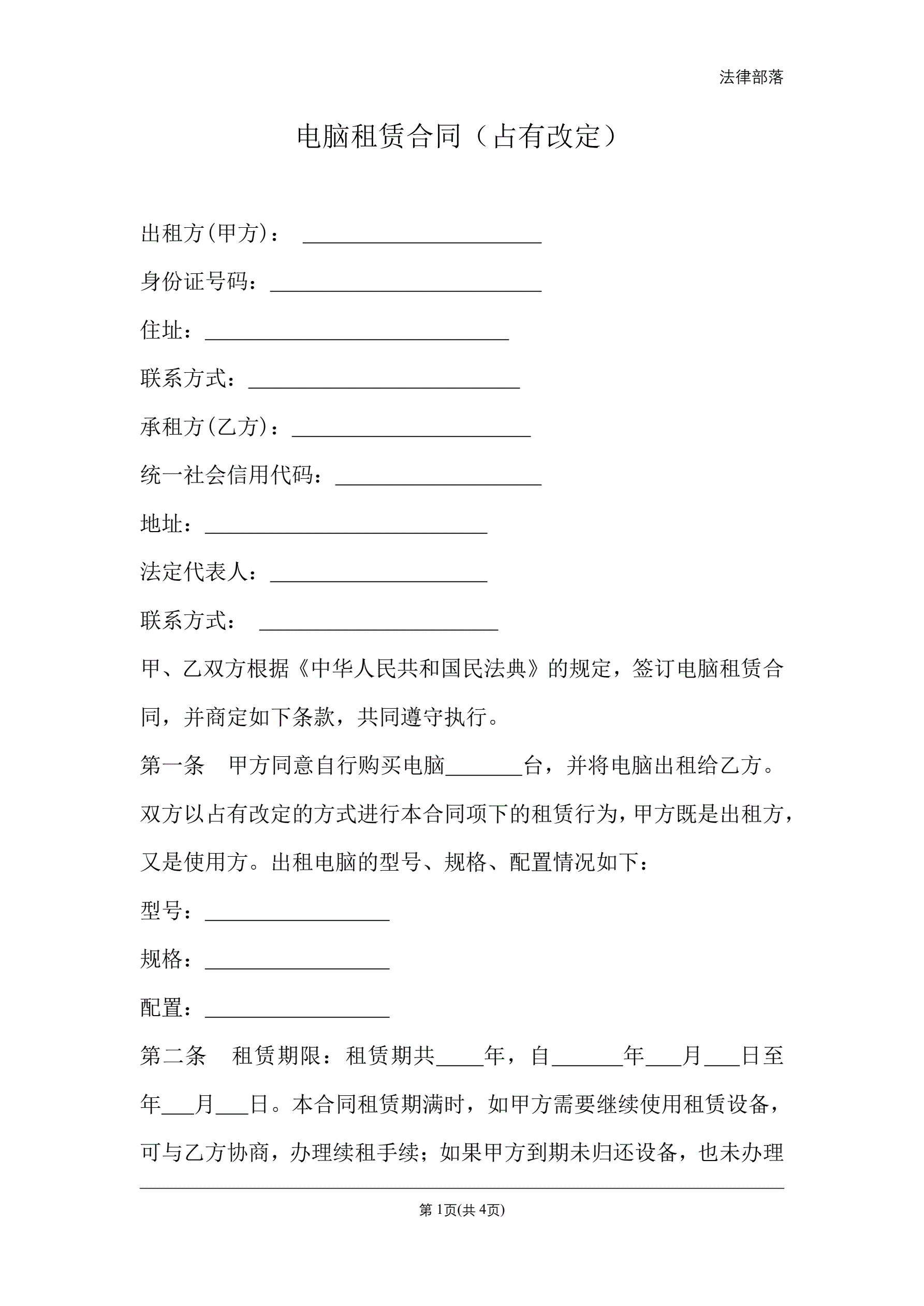 >电脑租赁合同(占有改定)