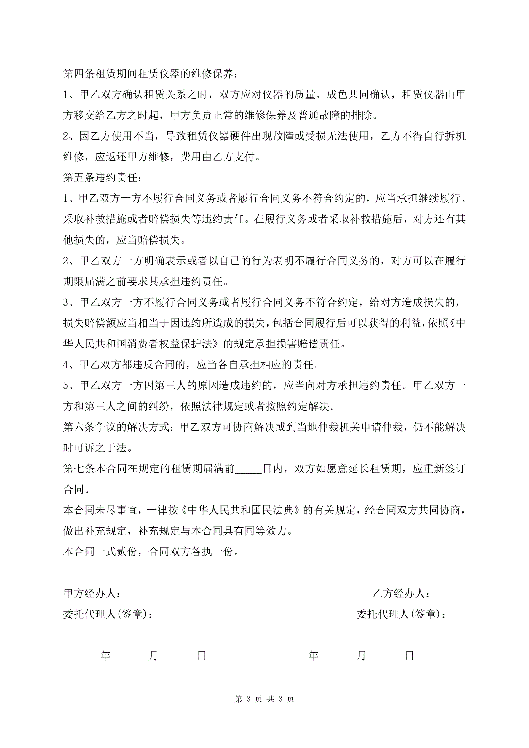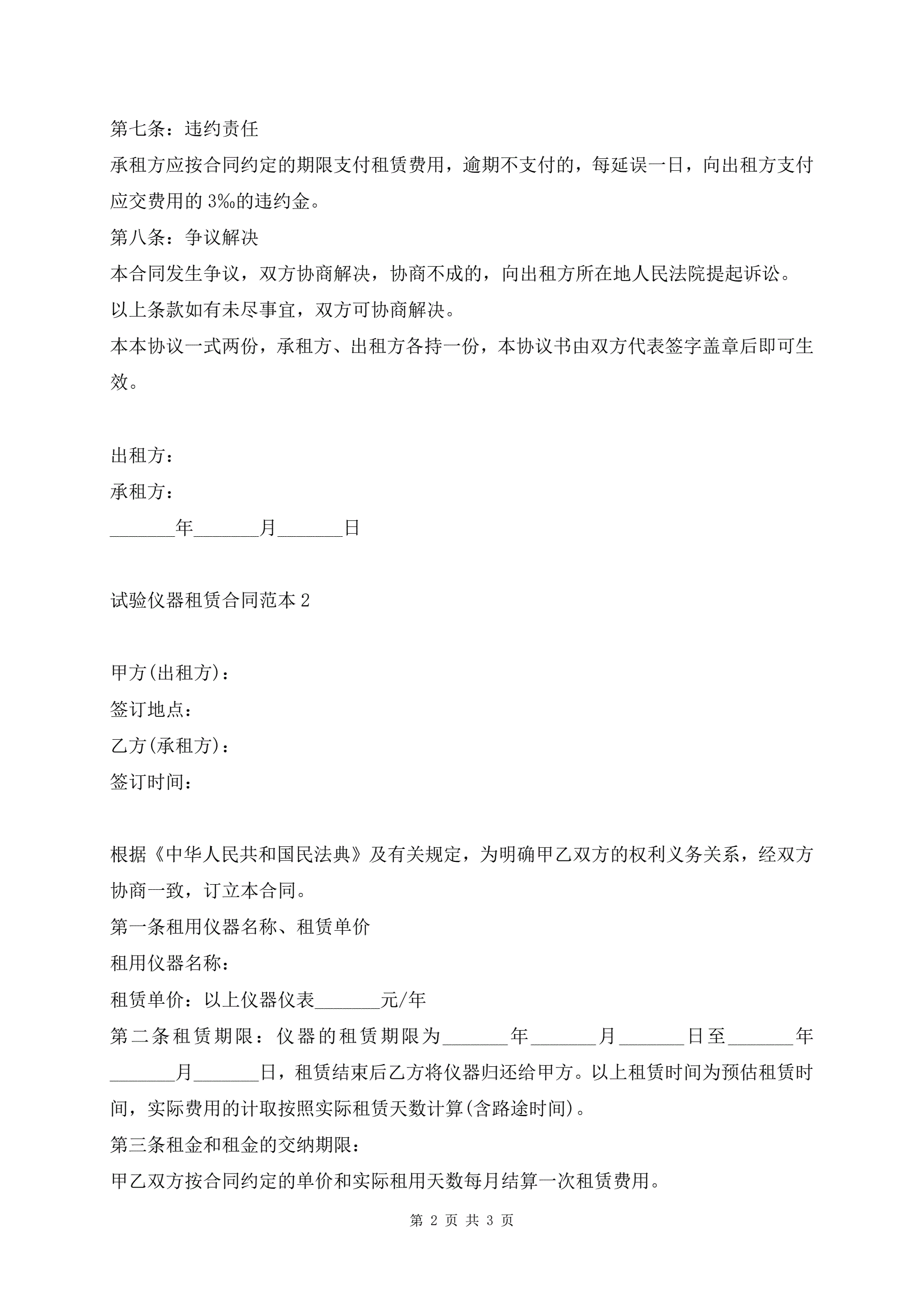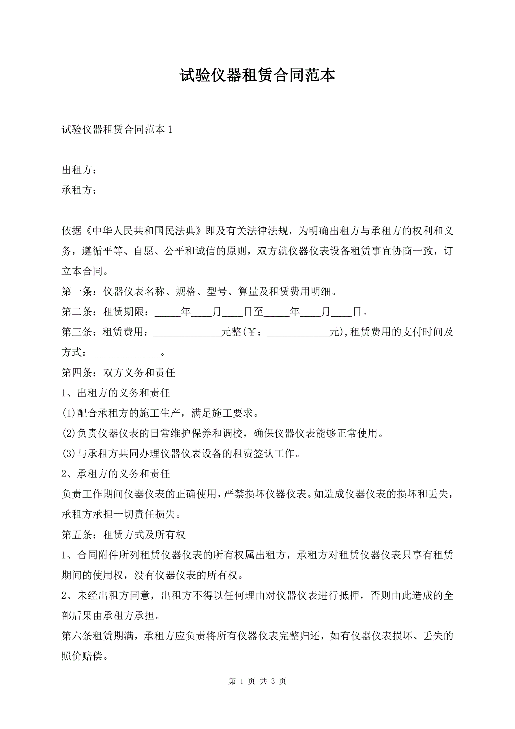 试验仪器租赁合同范本