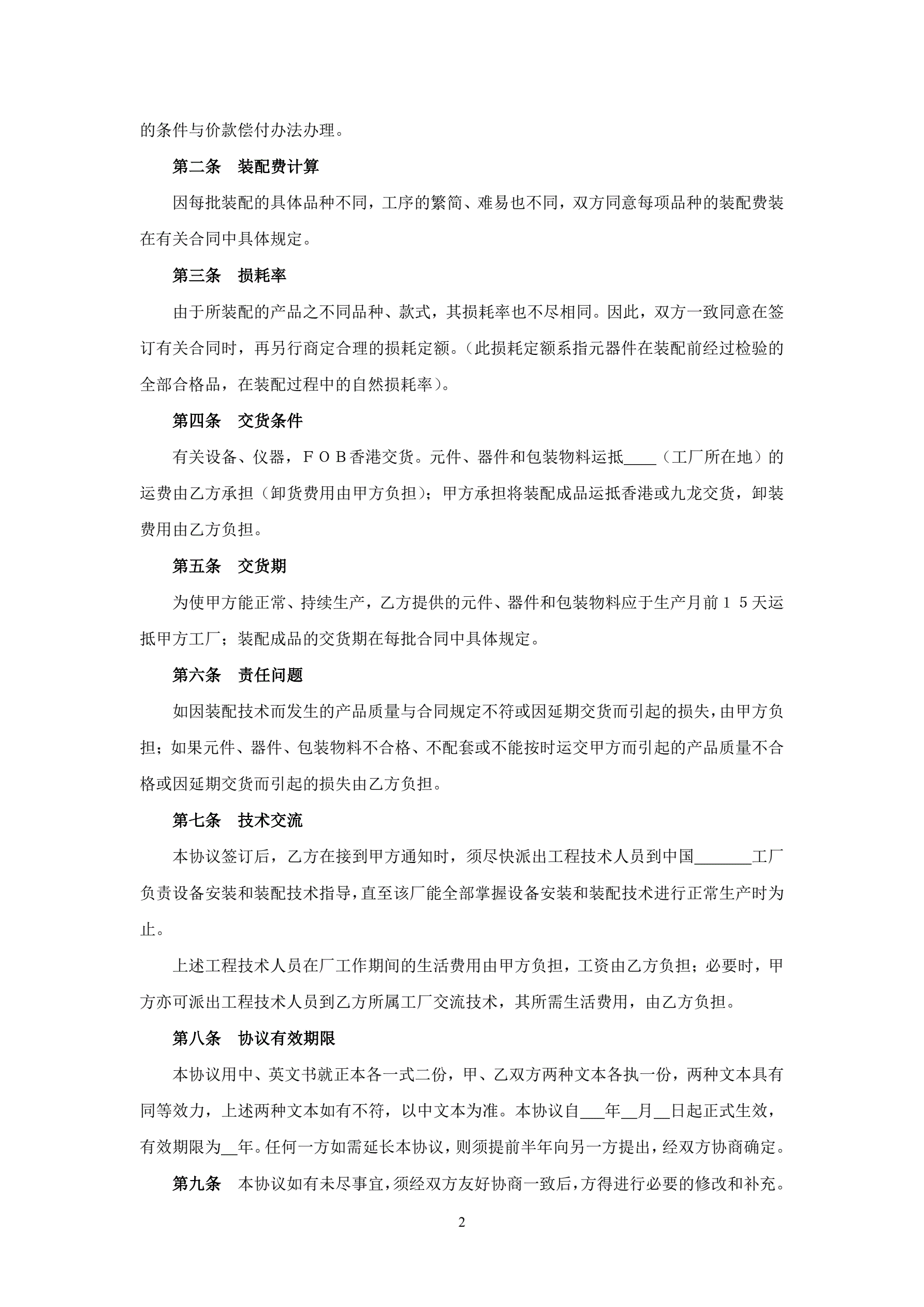 >对港来件装配协议书(收音机与电子钟收音机)