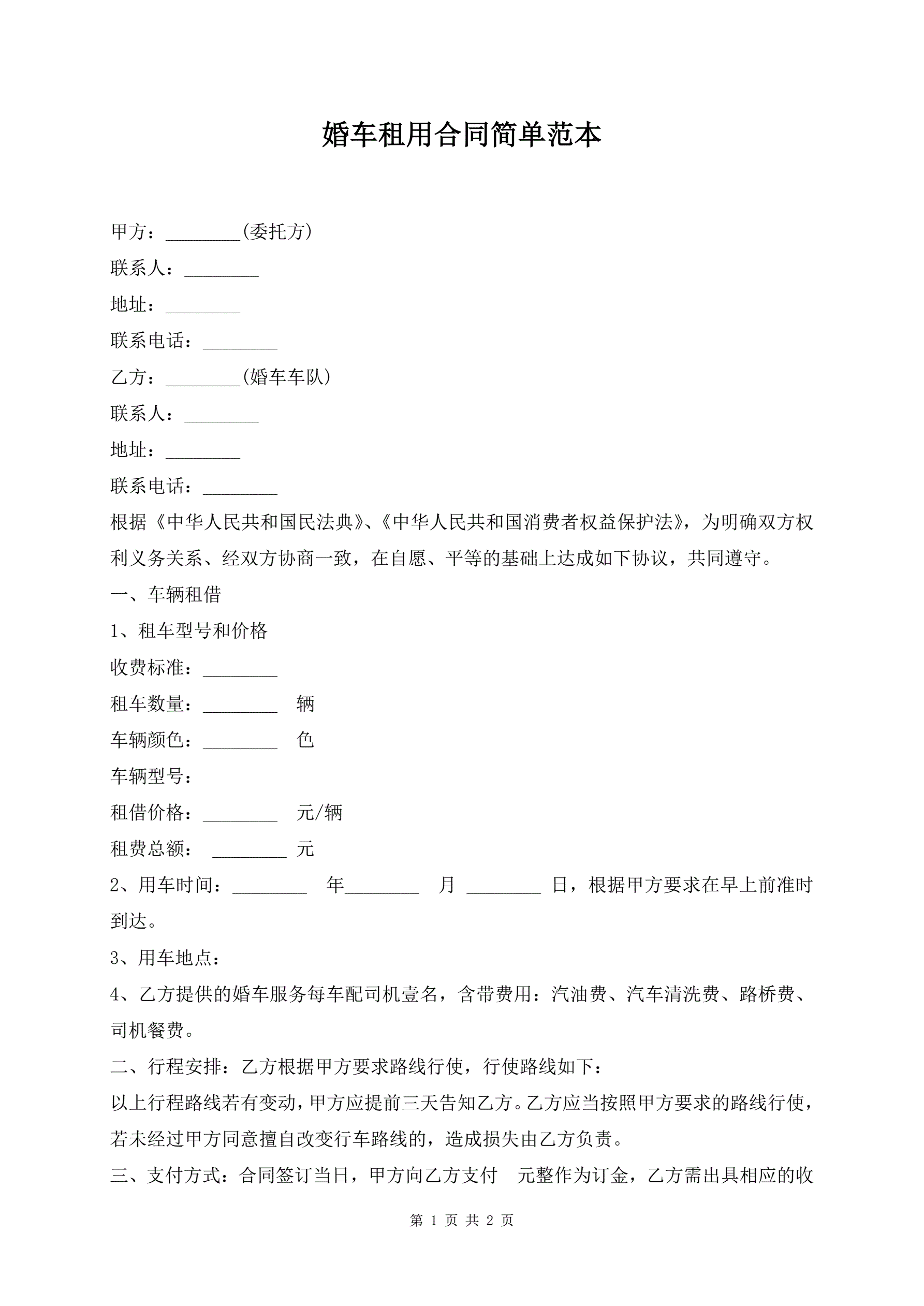 婚车租用合同简单范本