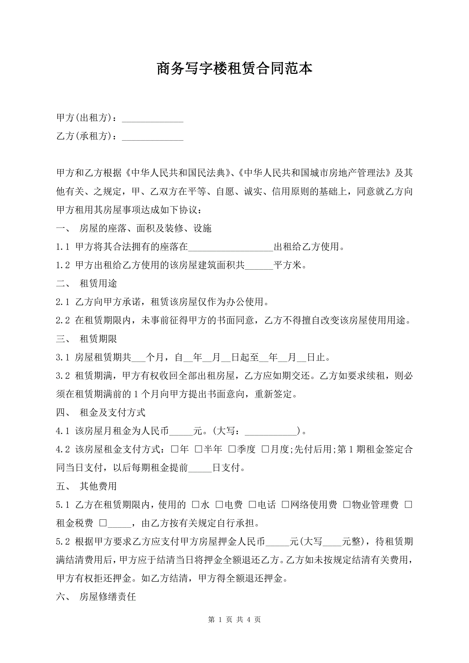 >商务写字楼租赁合同范本