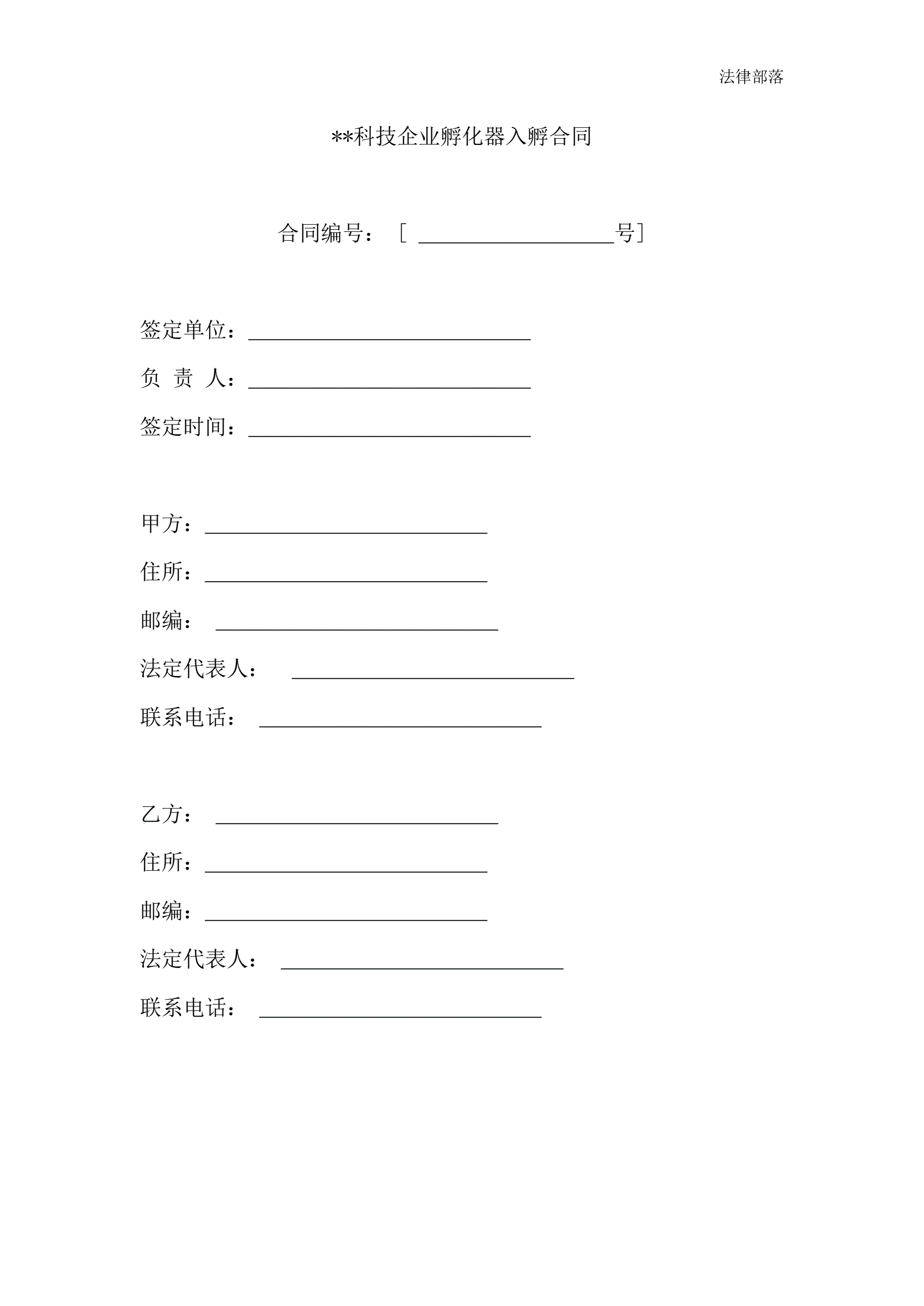 科技企业孵化器入孵合同