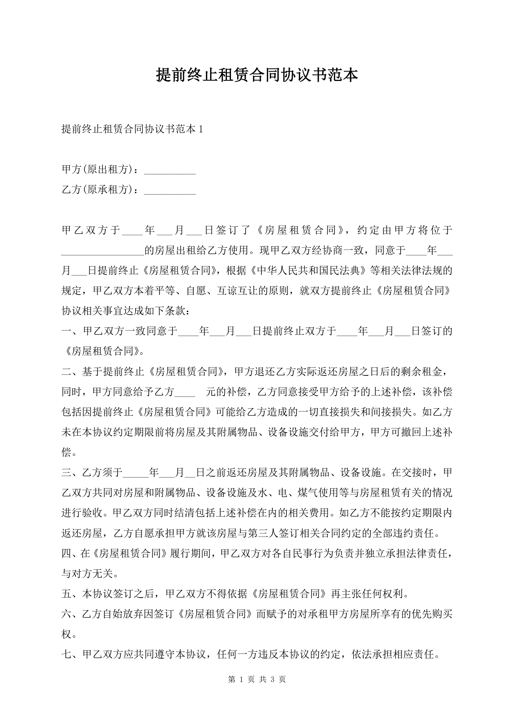 >提前终止租赁合同协议书范本