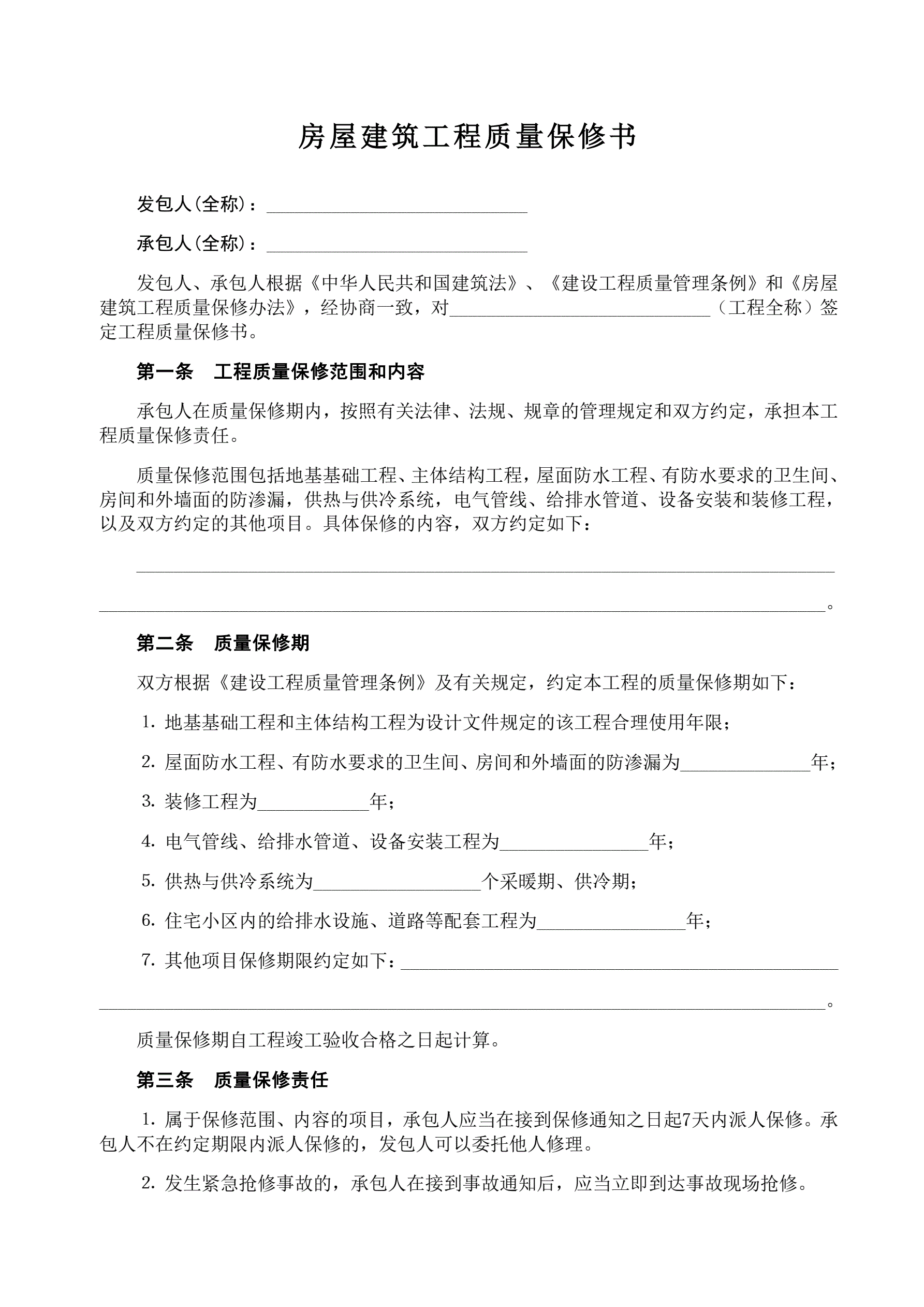 >《房屋建筑工程质量保修书》