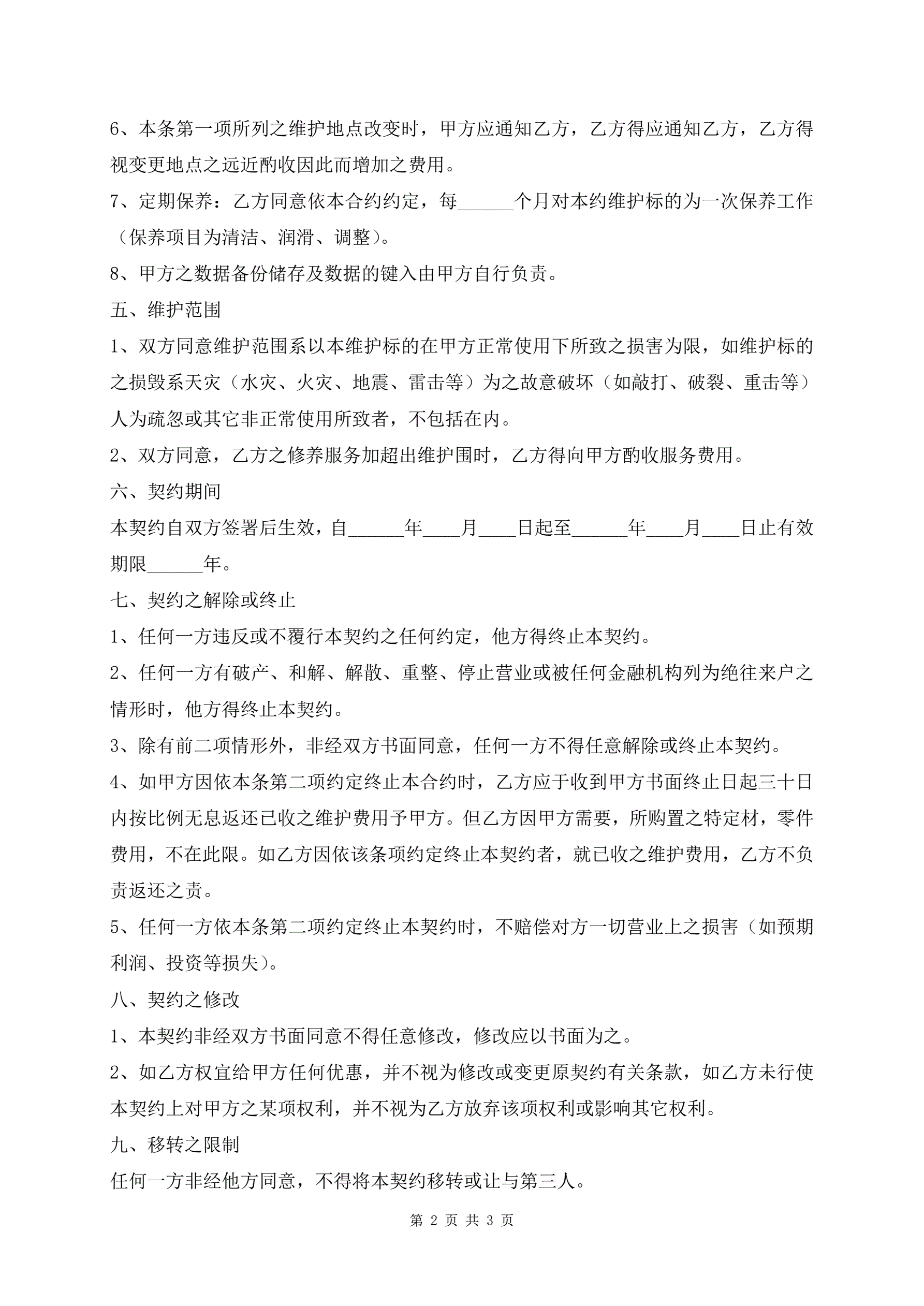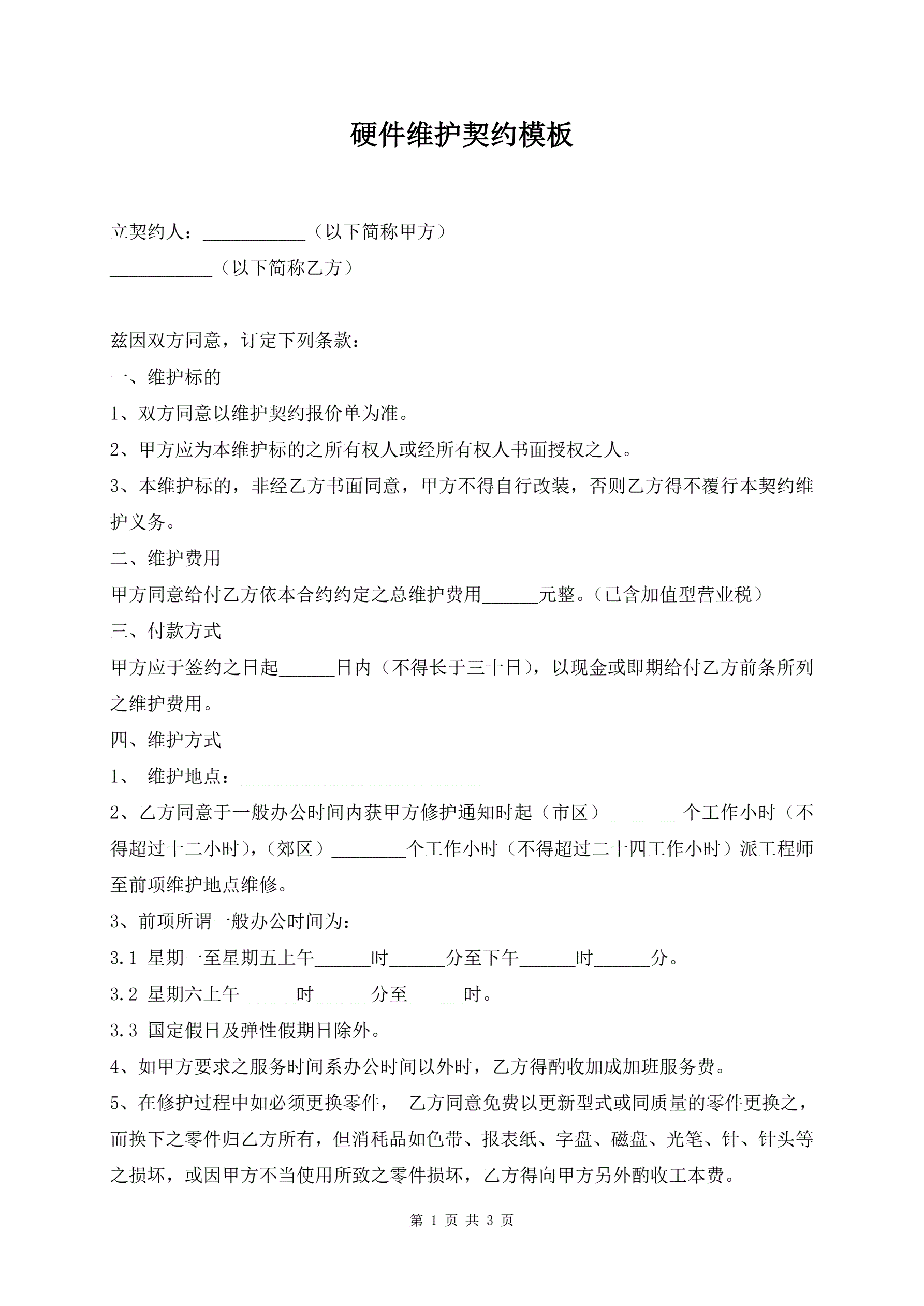>硬件维护契约模板
