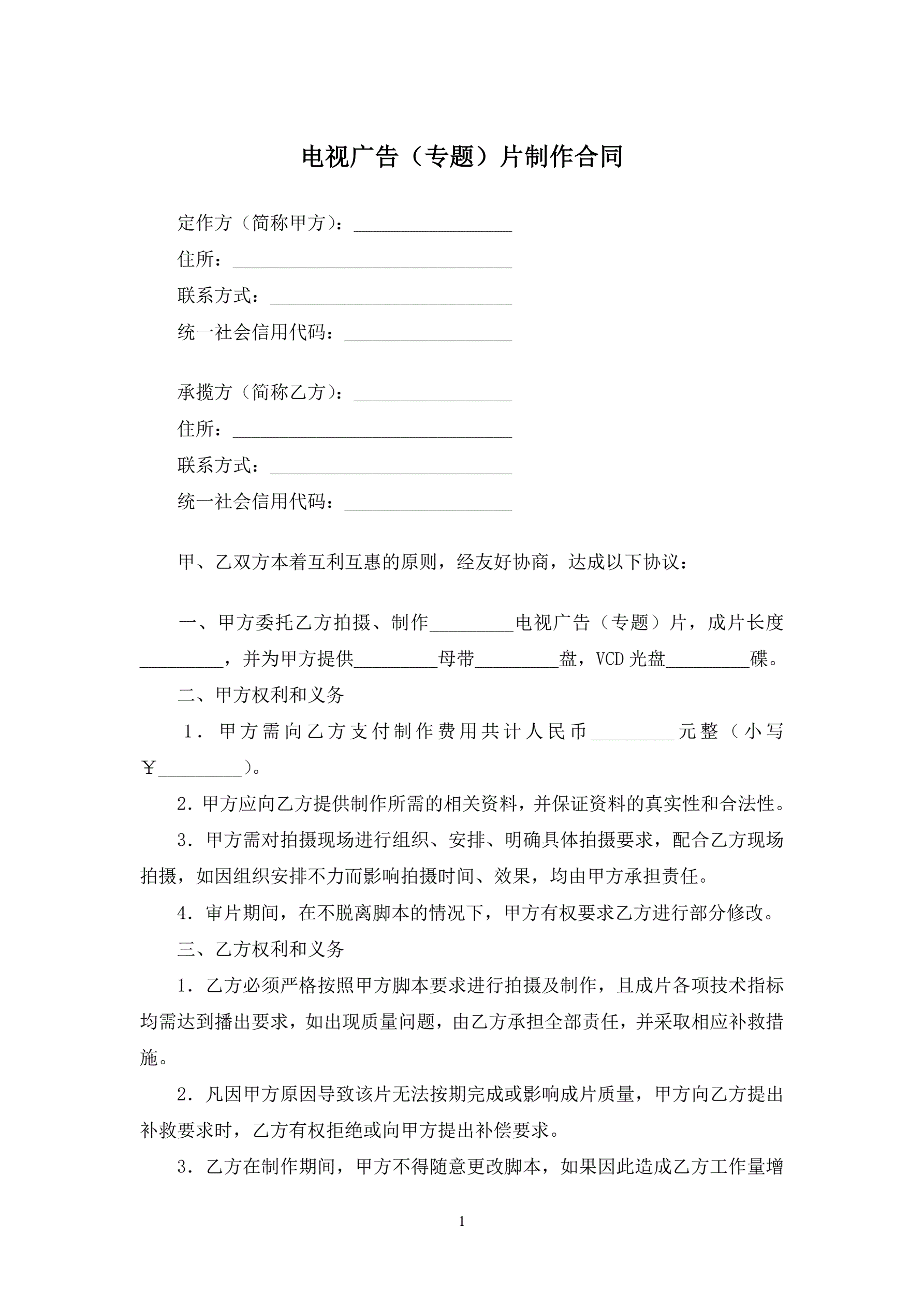 合同名称:电视广告(专题)片制作合同