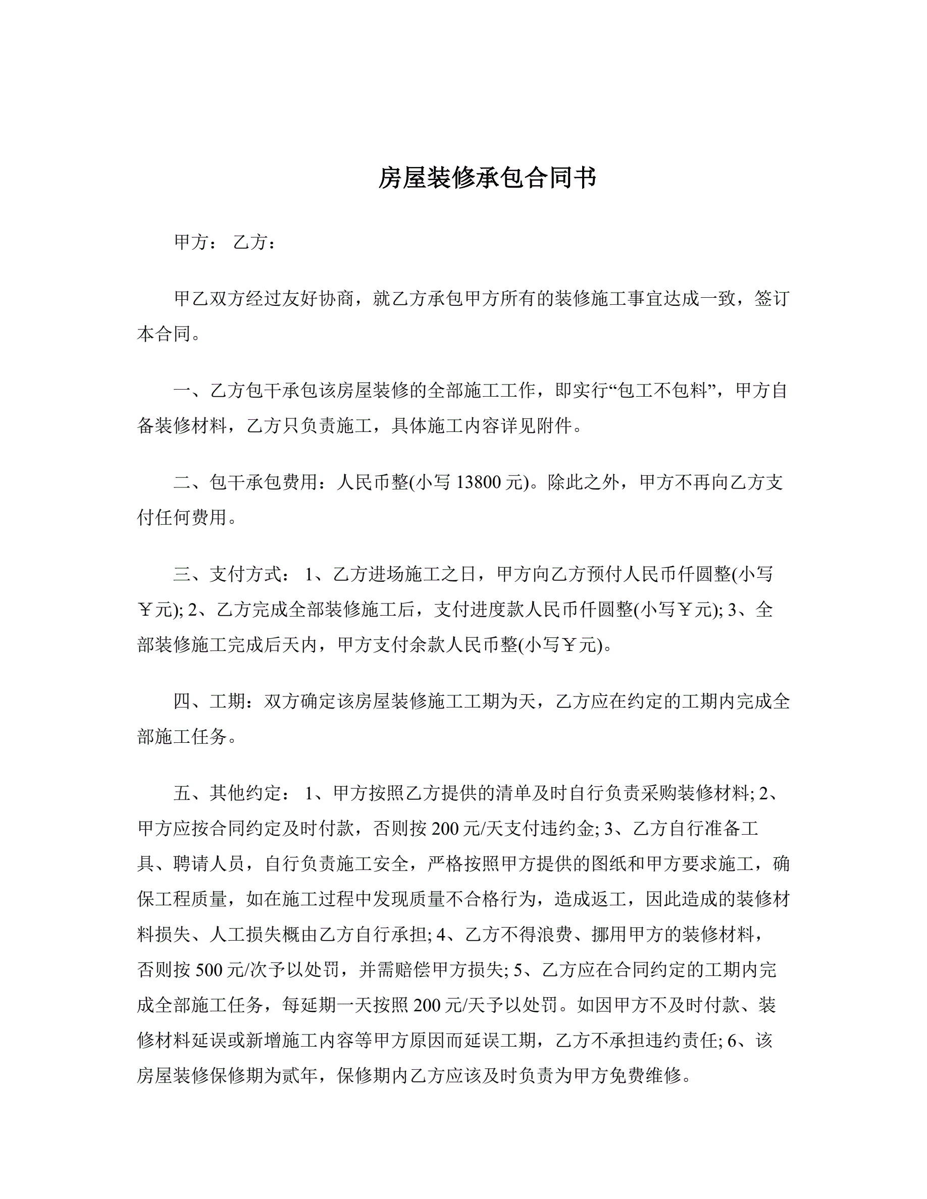 房屋装修承包合同书