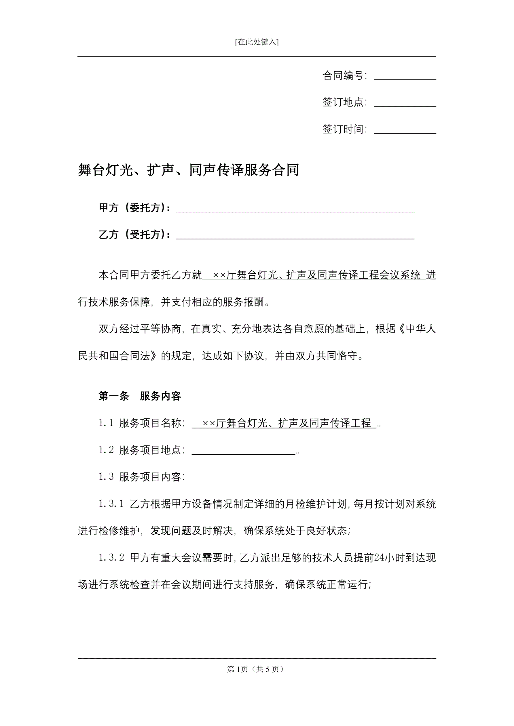 >舞台灯光、扩声、同声传译服务合同