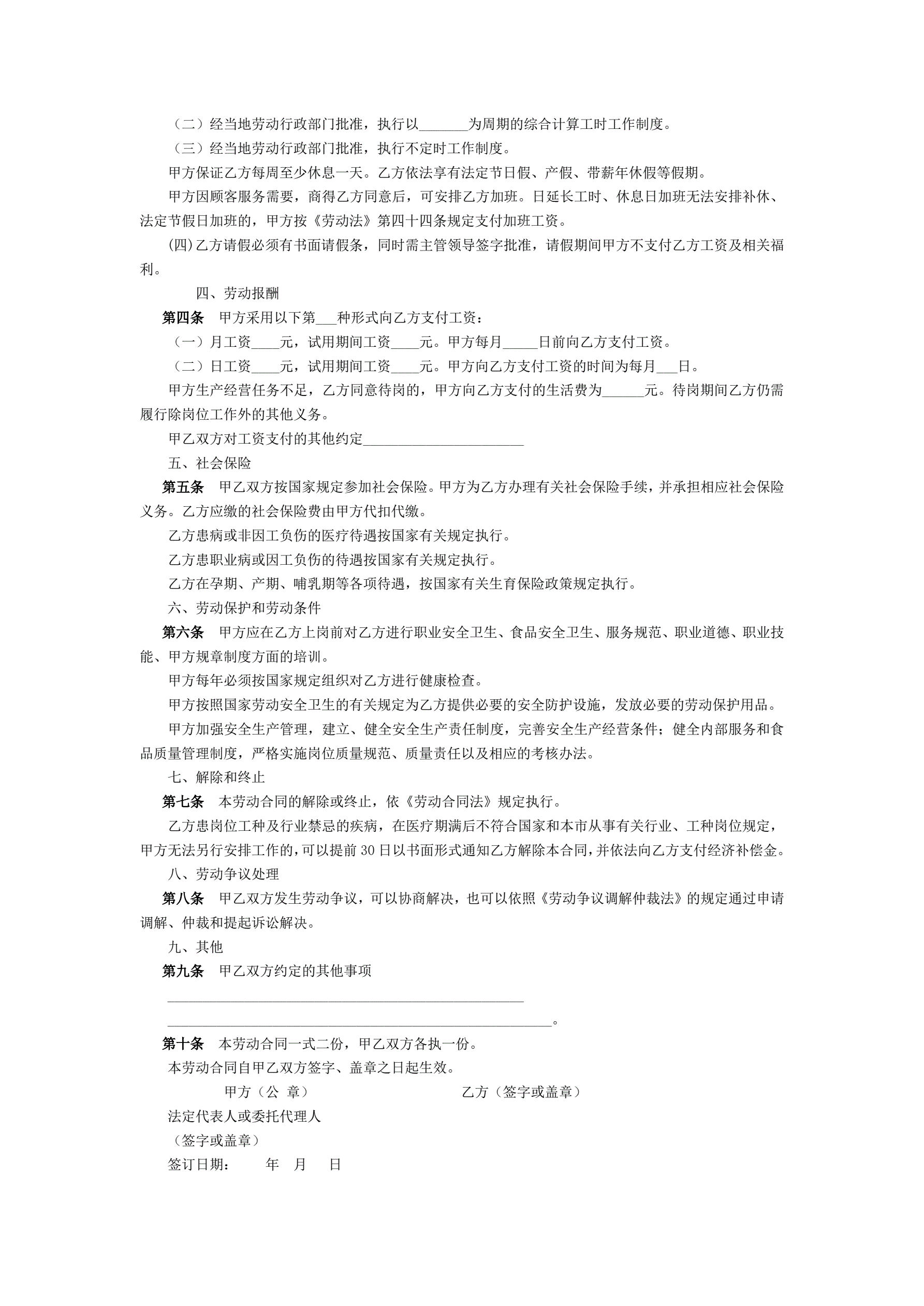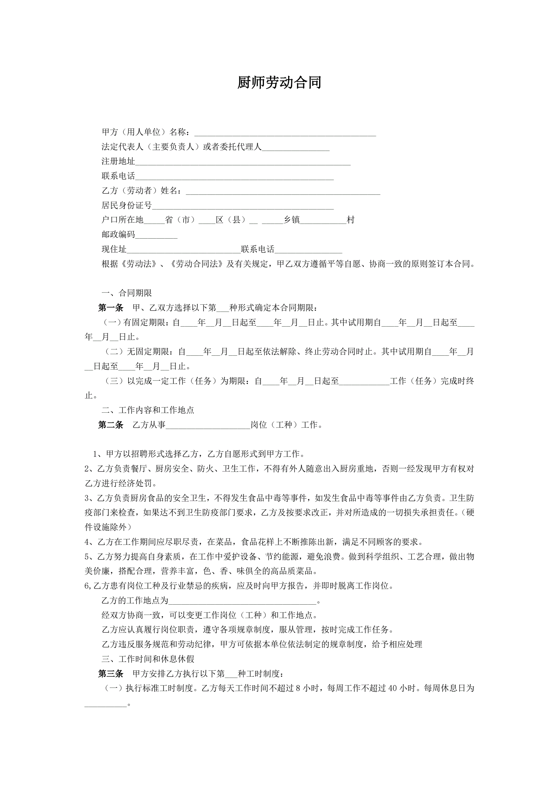 厨师劳动合同