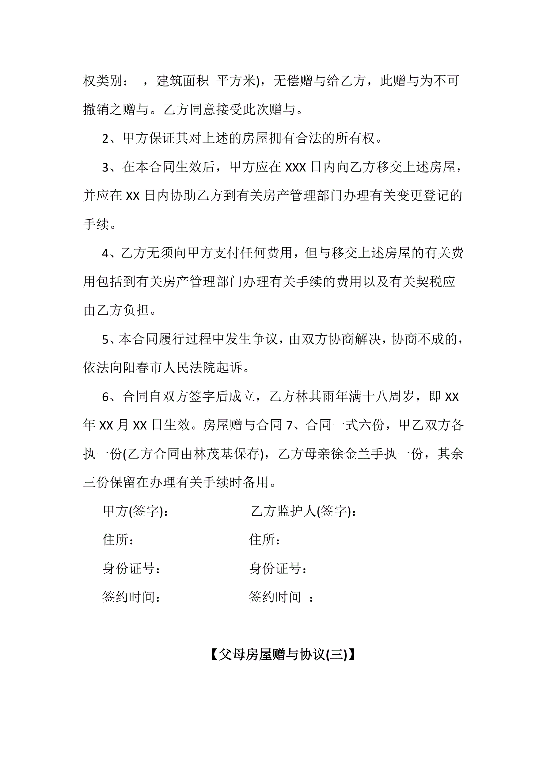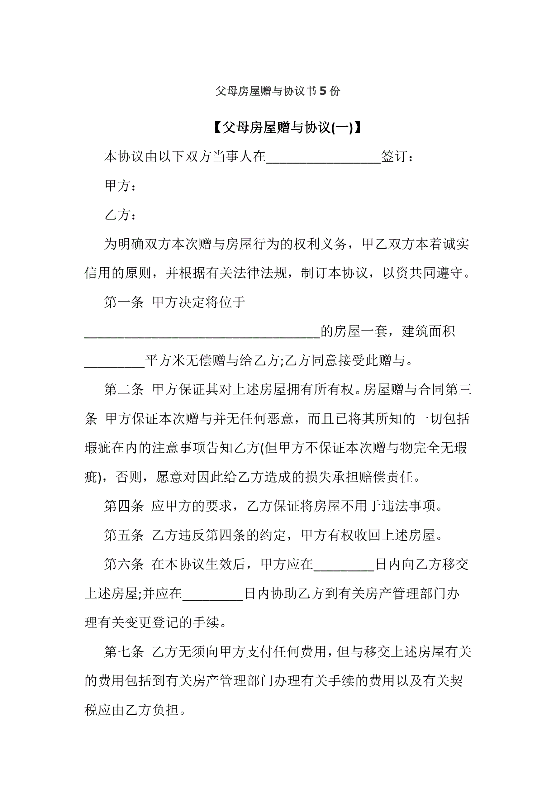 父母房屋赠与协议书5份