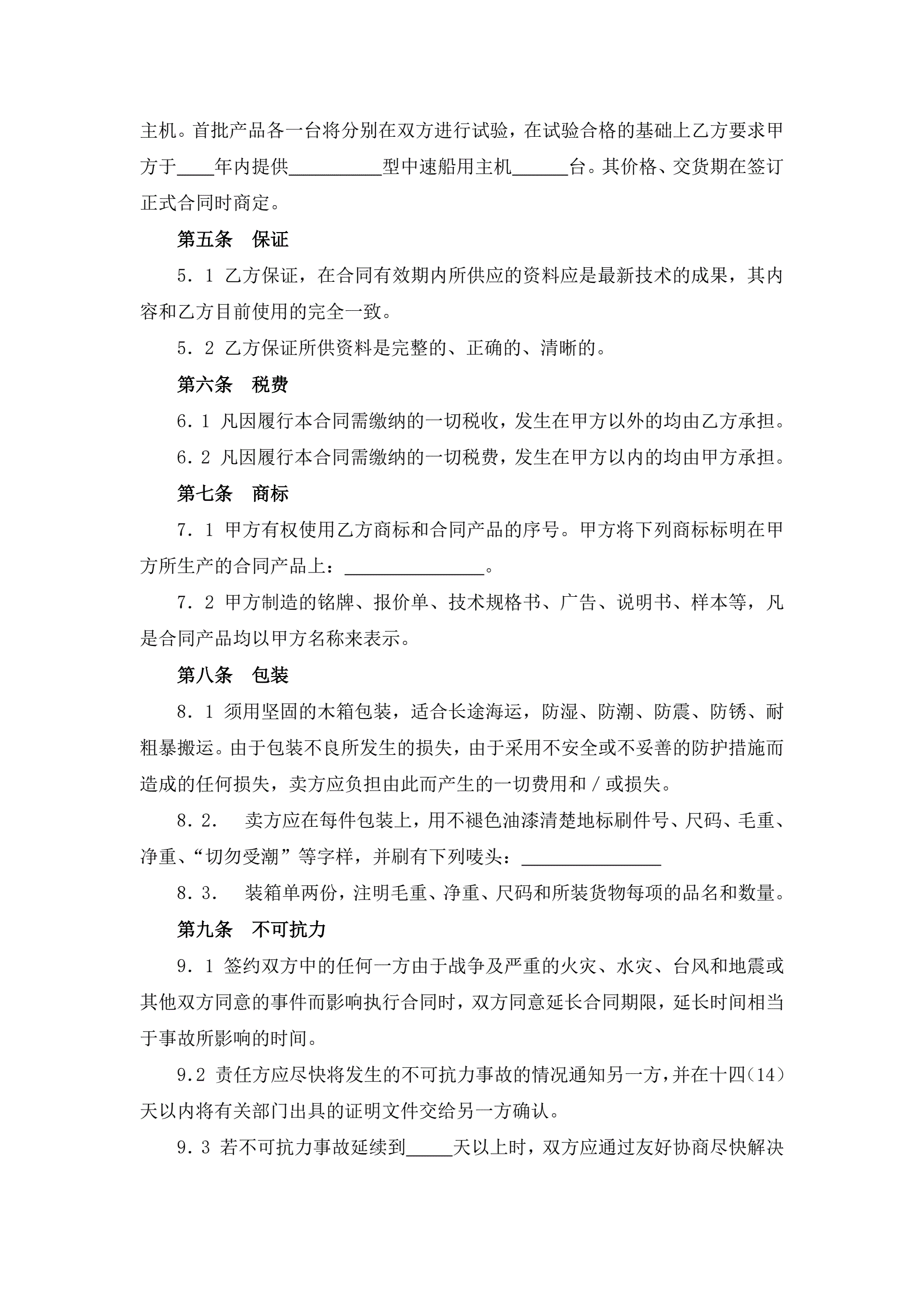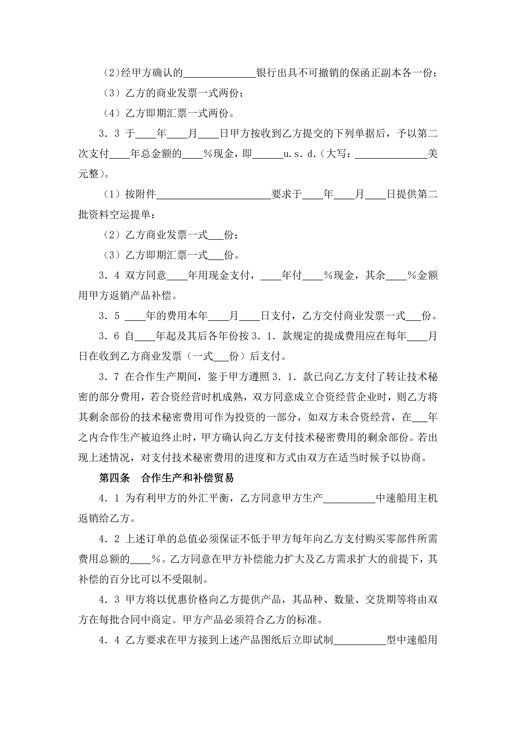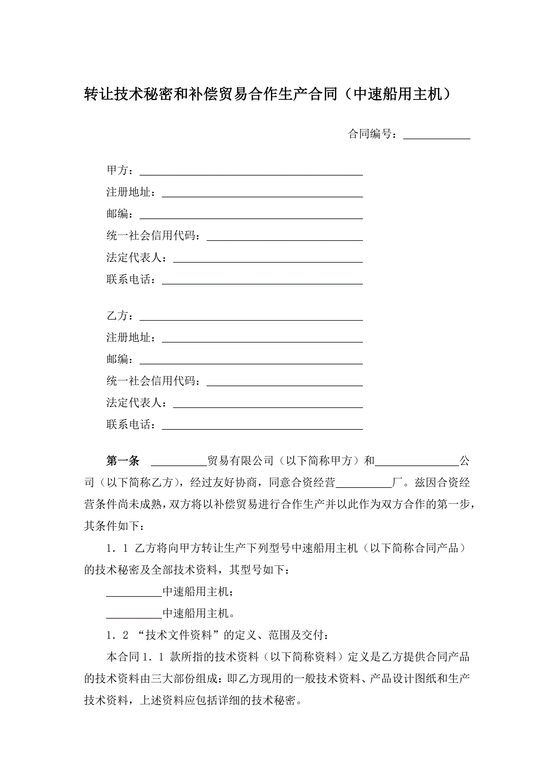 转让技术秘密和补偿贸易合作生产合同(中速船用主机)