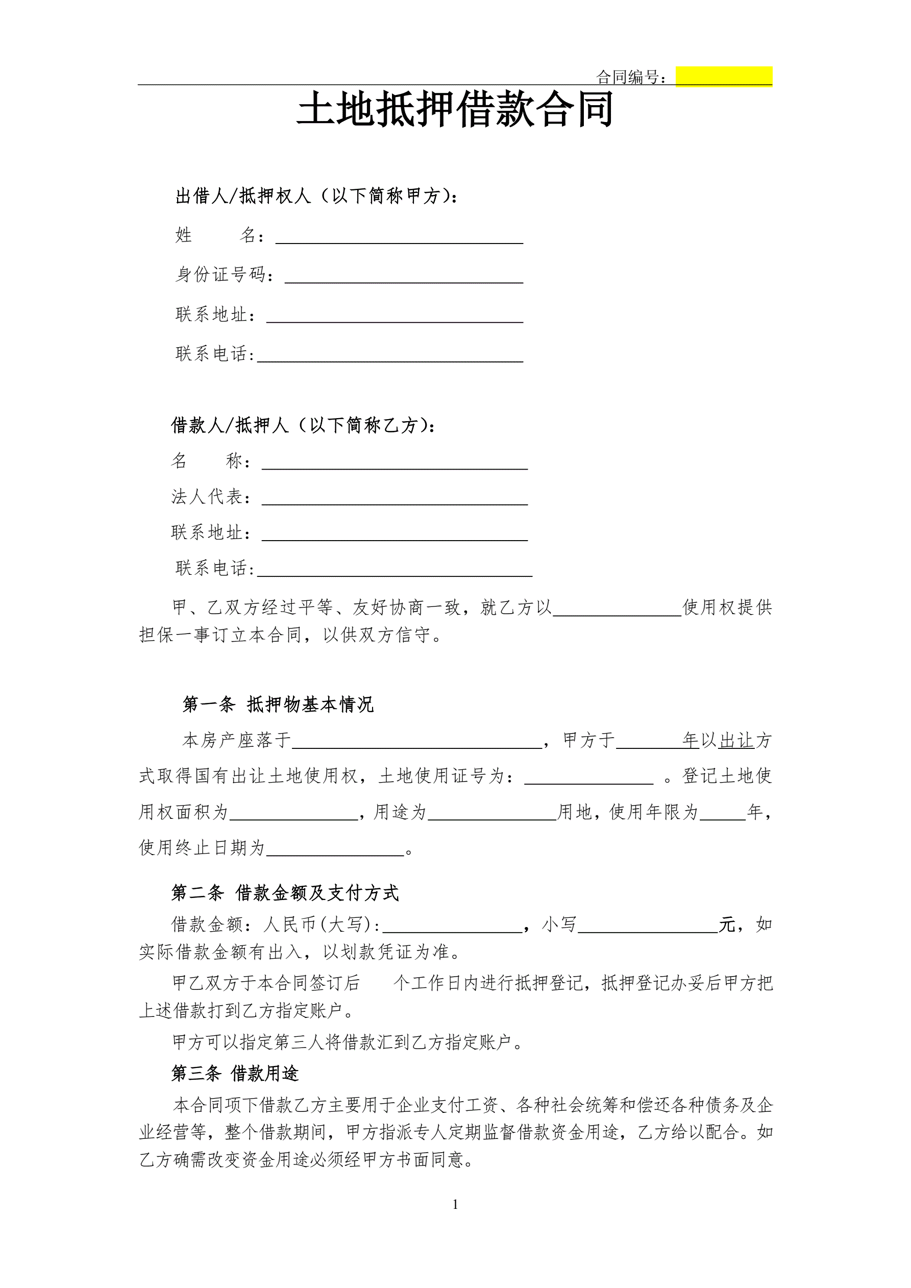 合同名称:土地抵押借款合同(修订版)
