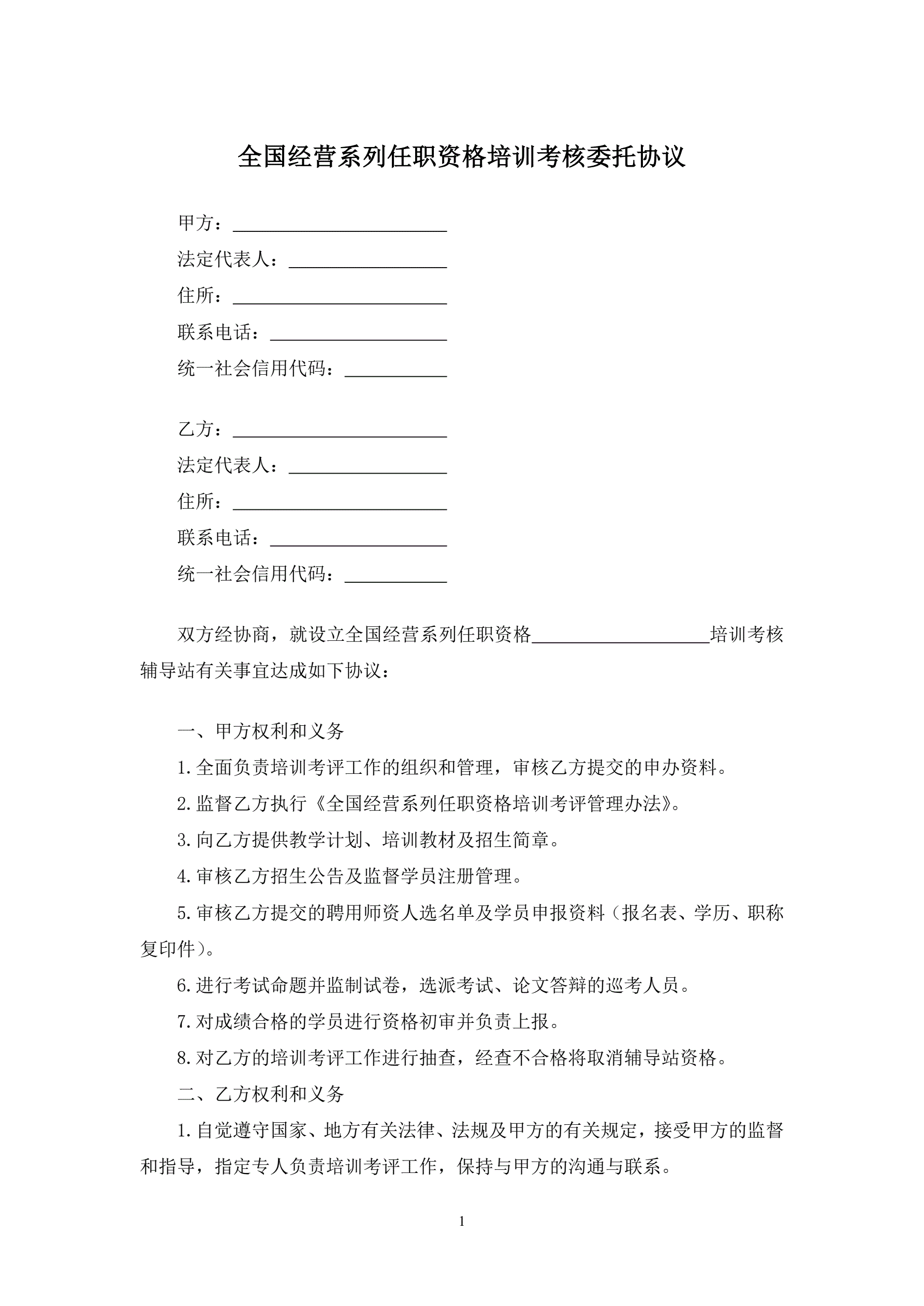 >全国经营系列任职资格培训考核委托协议