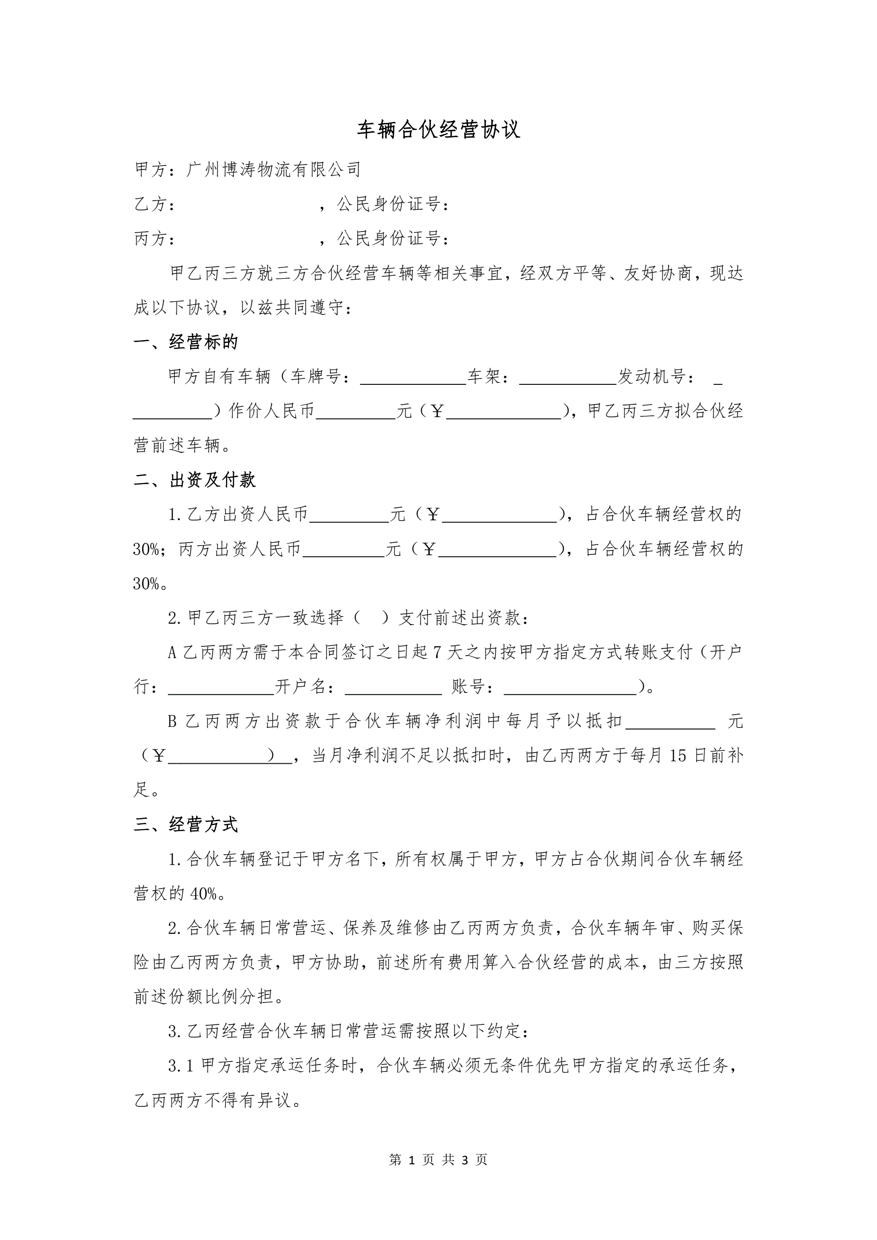 >车辆合伙经营协议