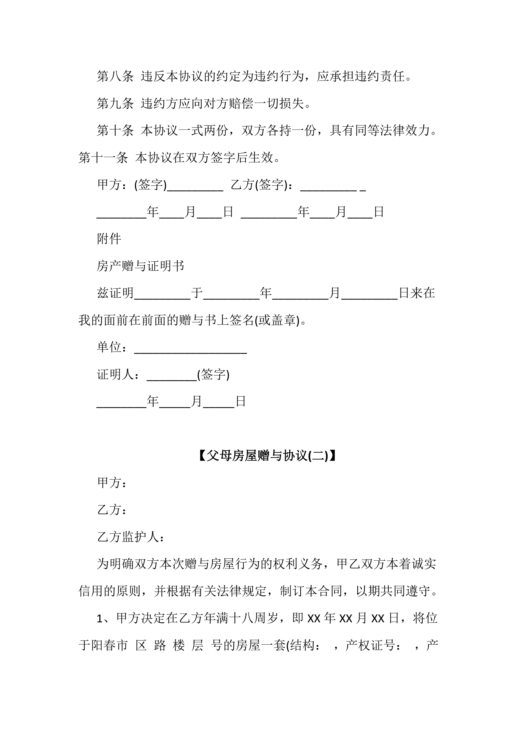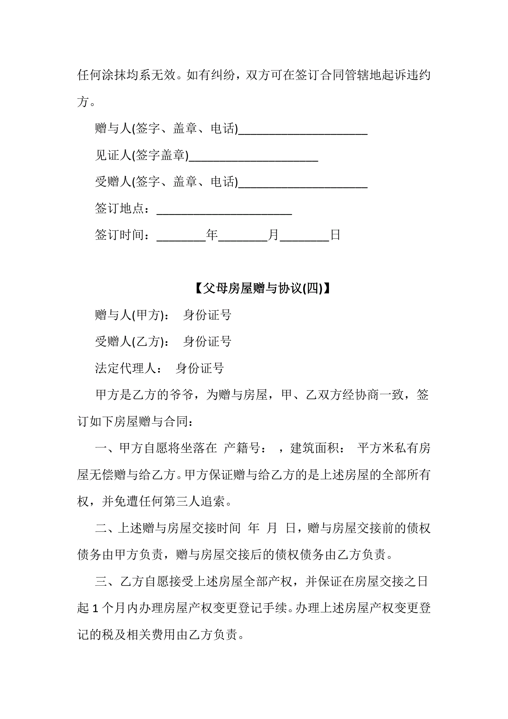 父母房屋赠与协议书5份