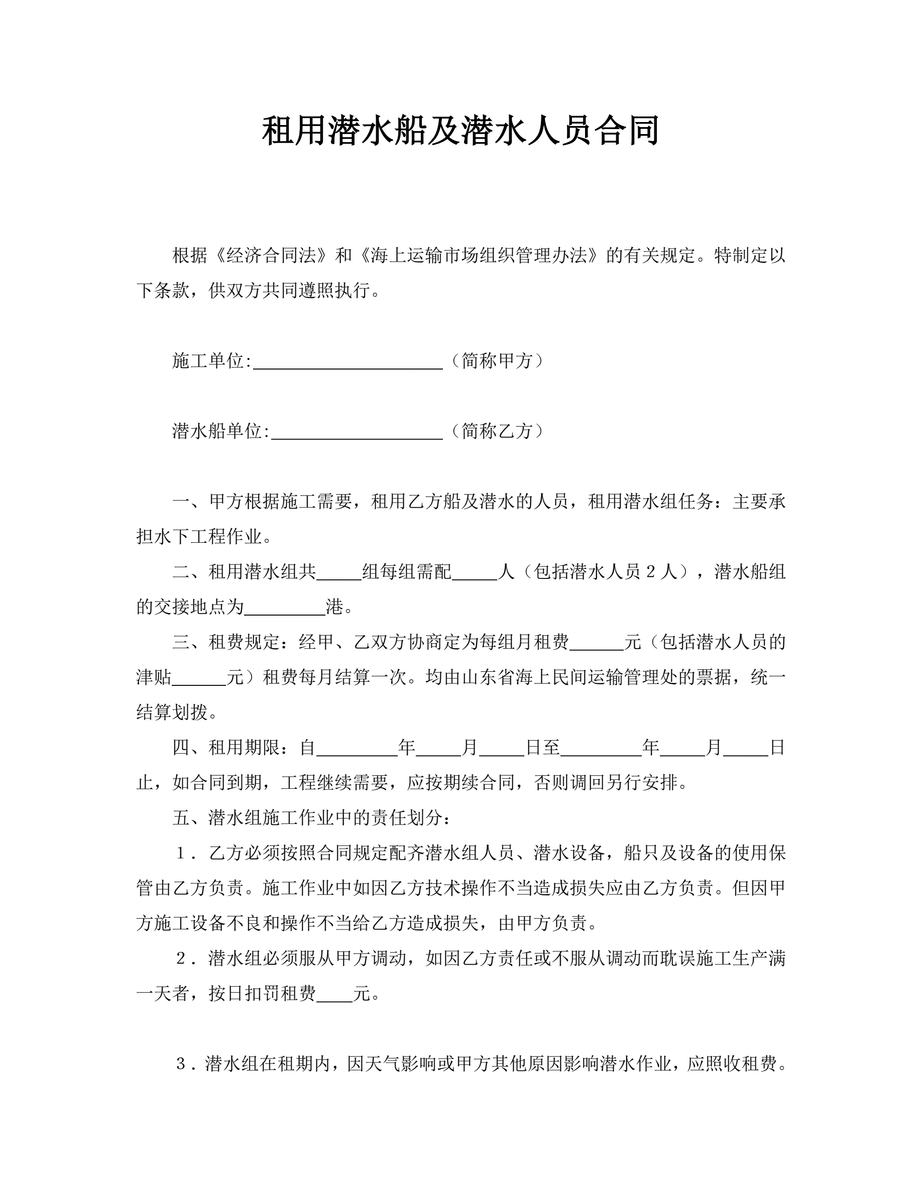 >租用潜水船及潜水人员合同