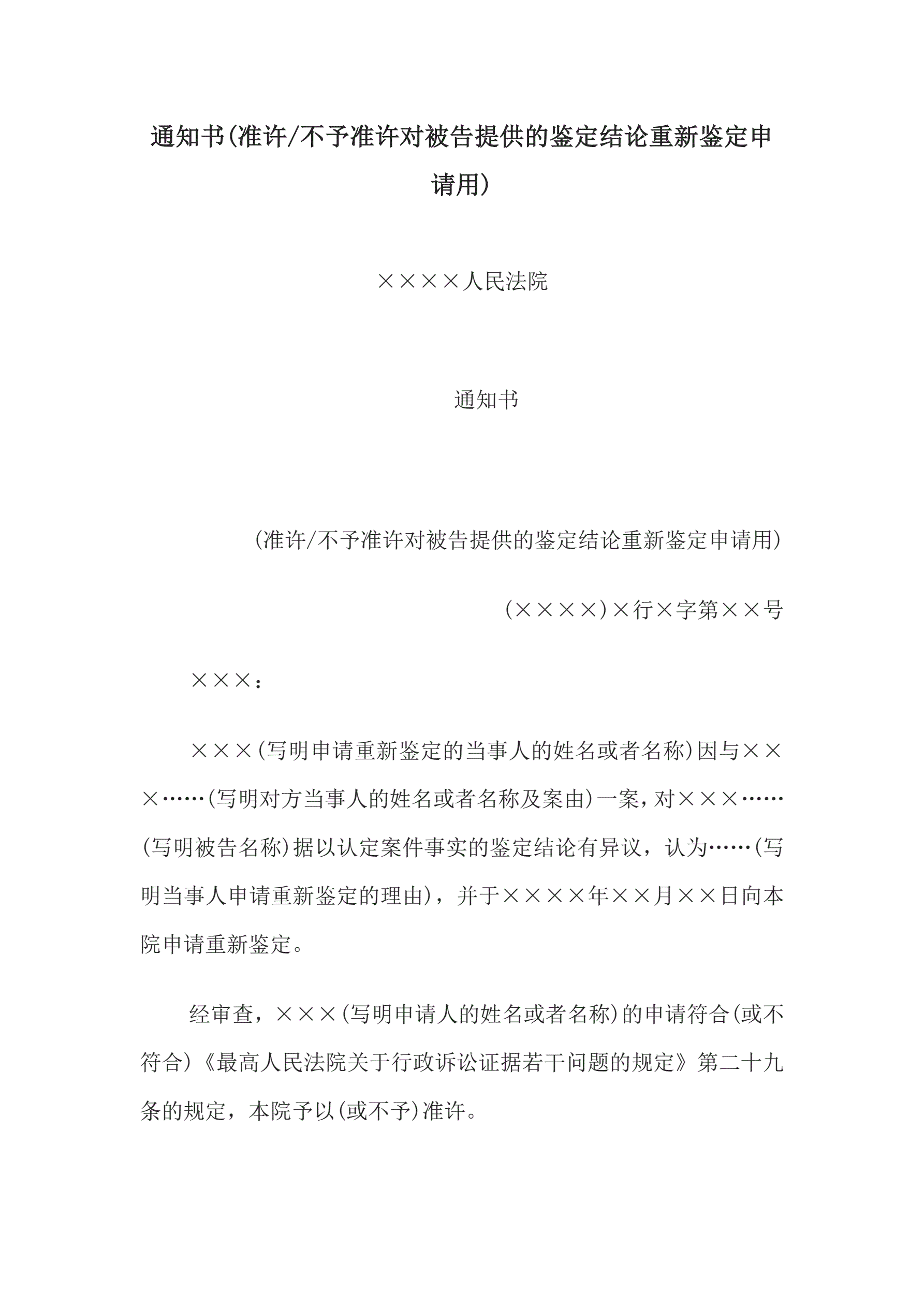 >通知书(准许或不予准许对被告提供的鉴定结论重新鉴定申请用)