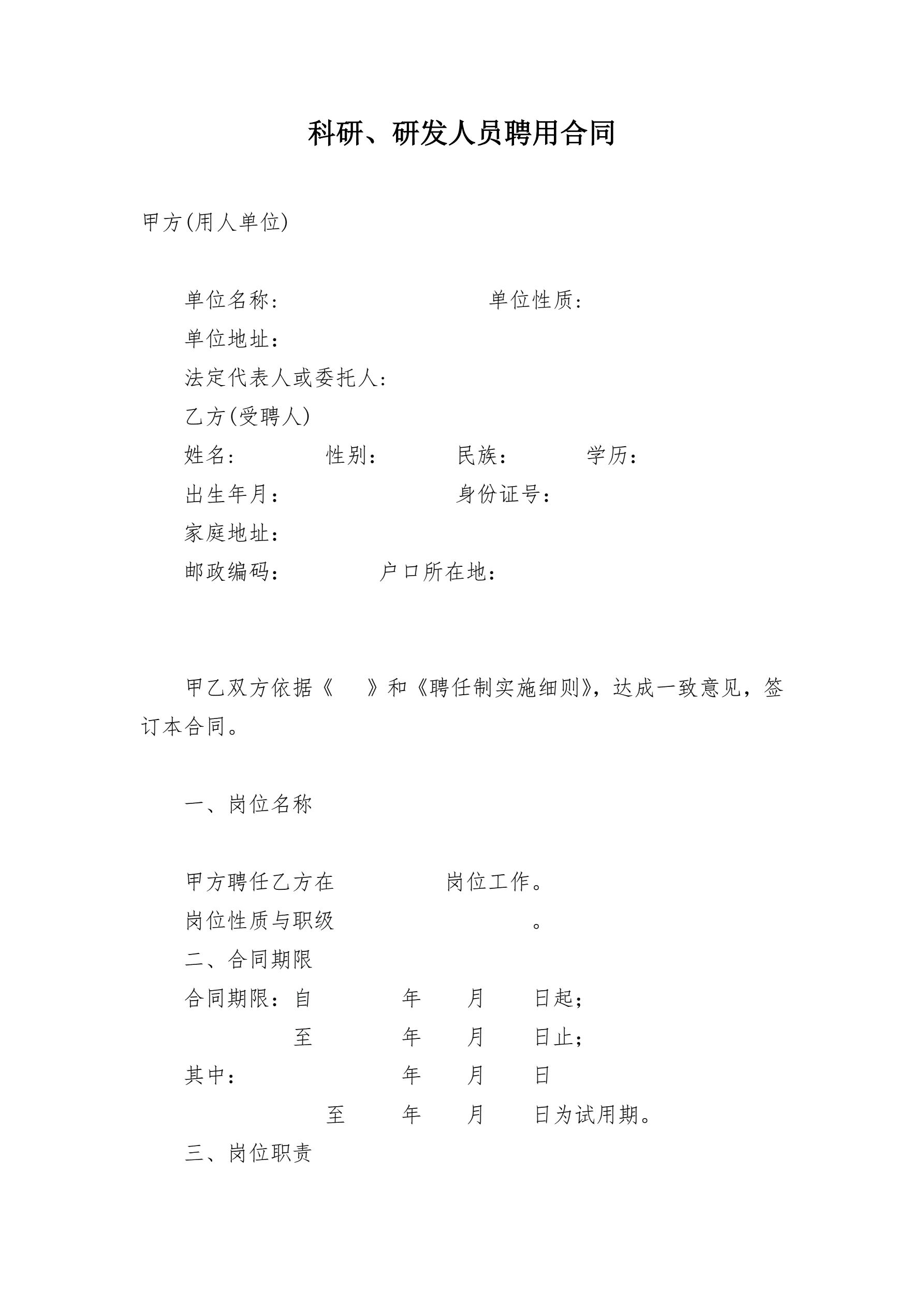 科研、研发人员聘用合同