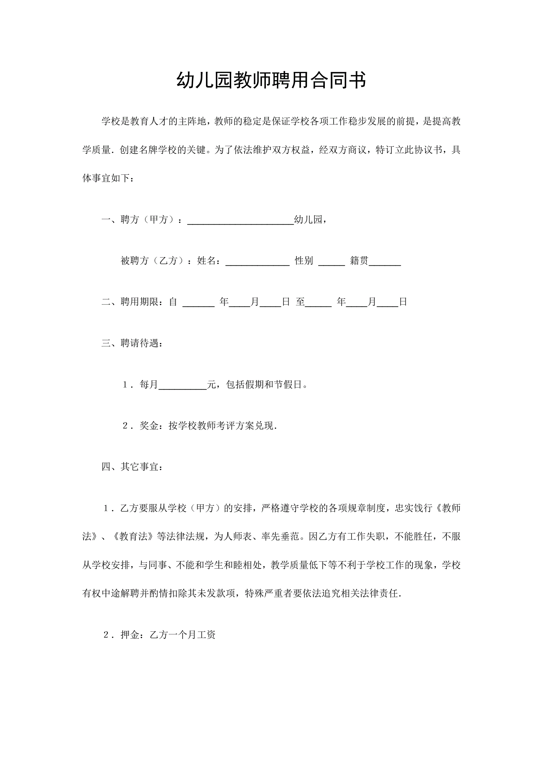 幼儿园教师聘用合同书