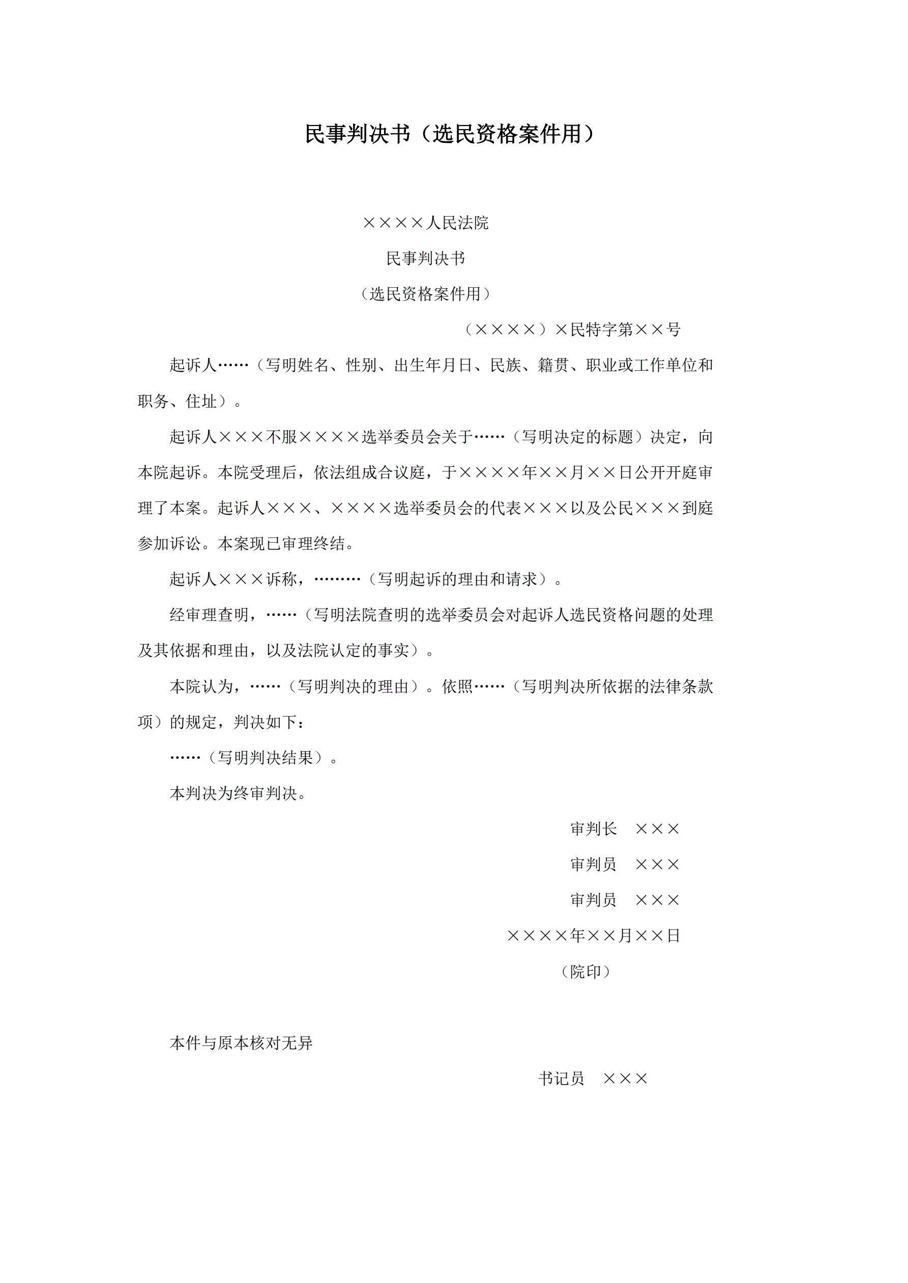 >民事判决书(选民资格案件用)