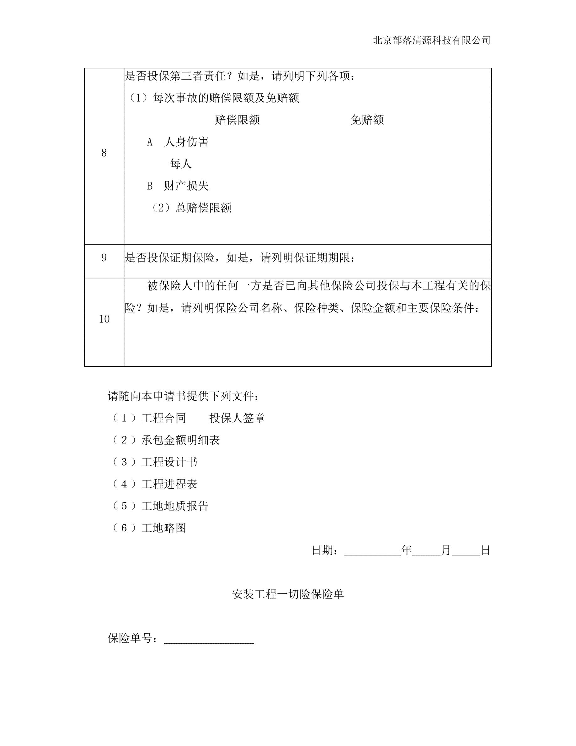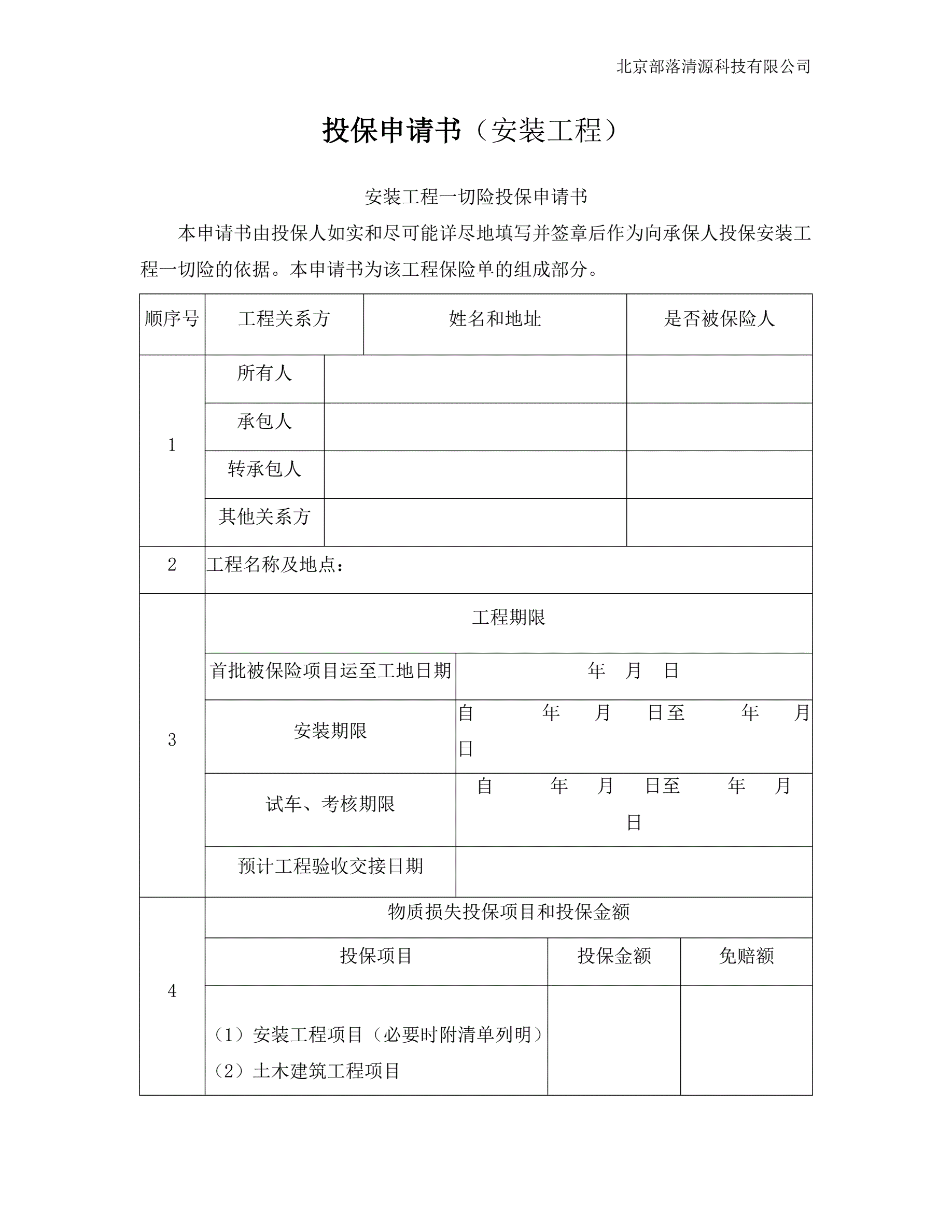 >安装工程一切险投保申请书