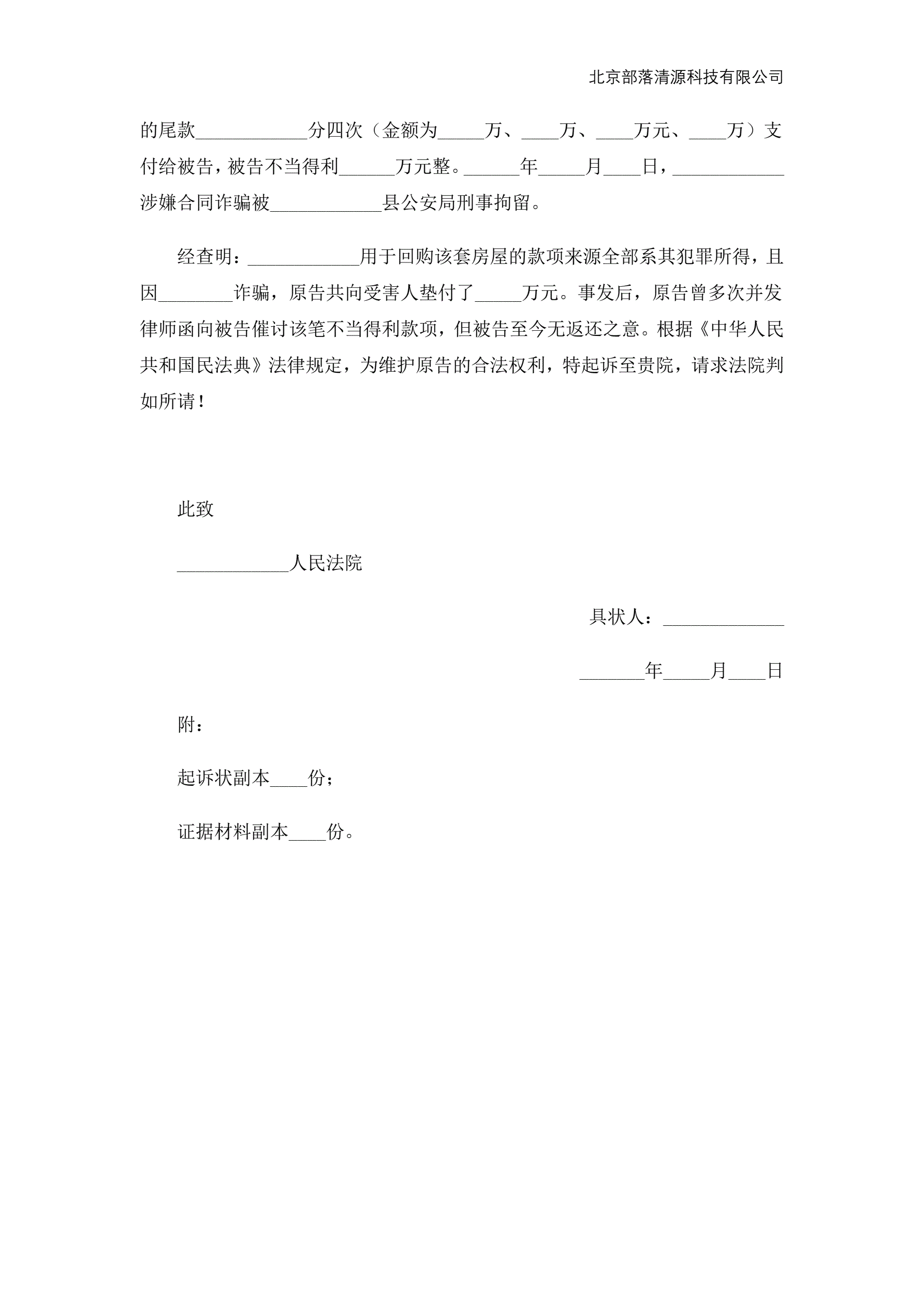 返还不当得利起诉状范本