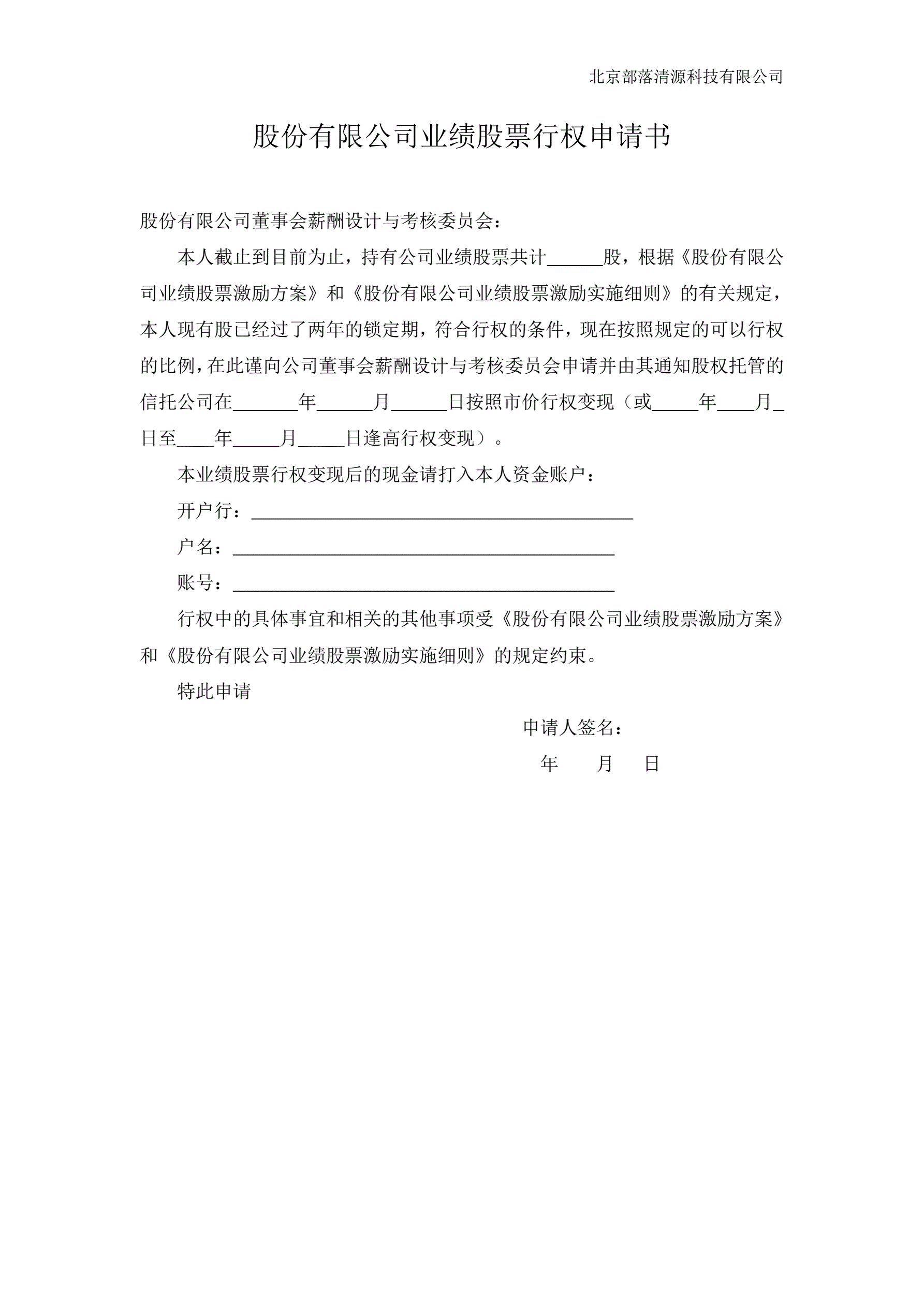 业绩股票行权申请书
