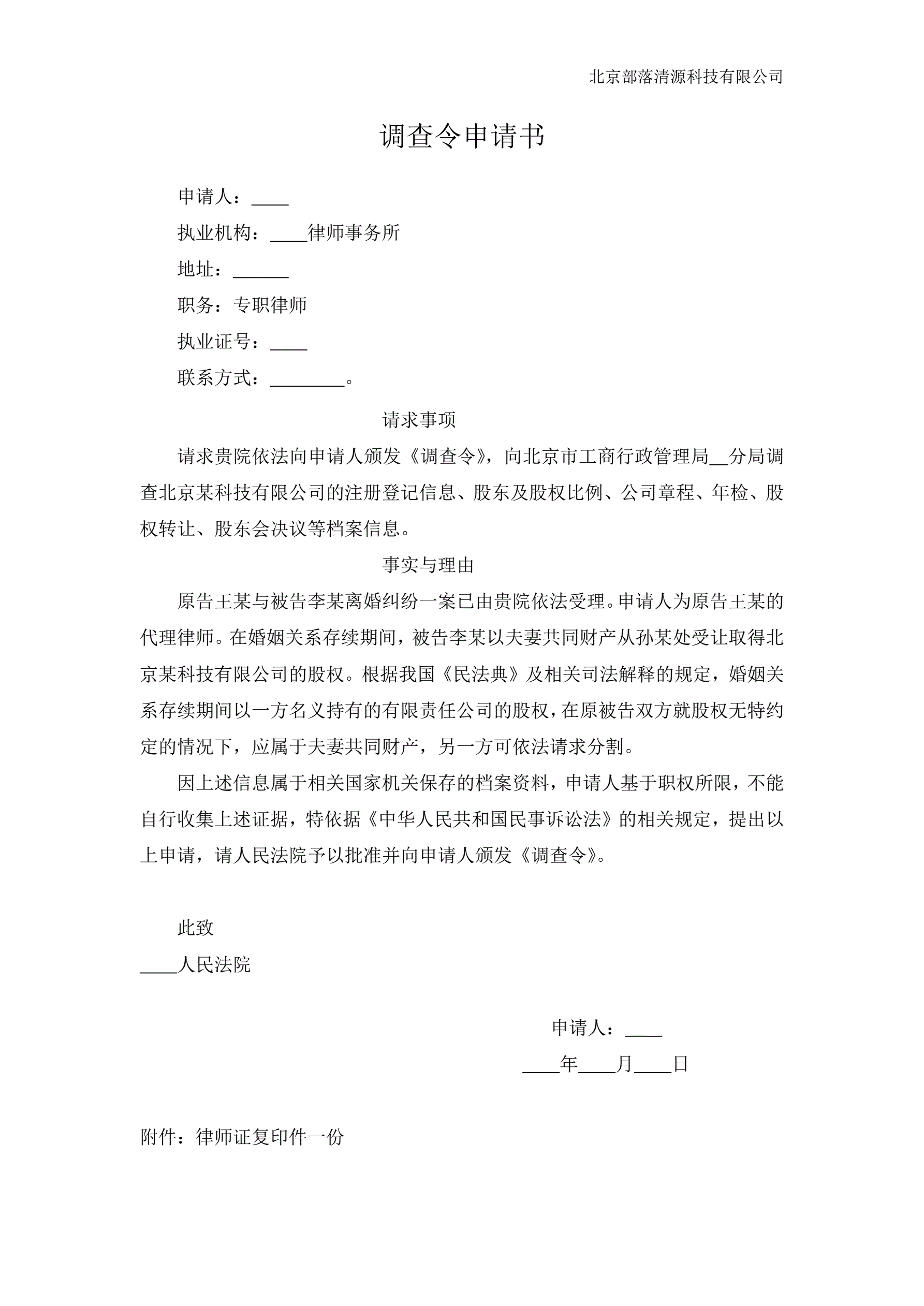 >调查令申请书(调公司档案信息)