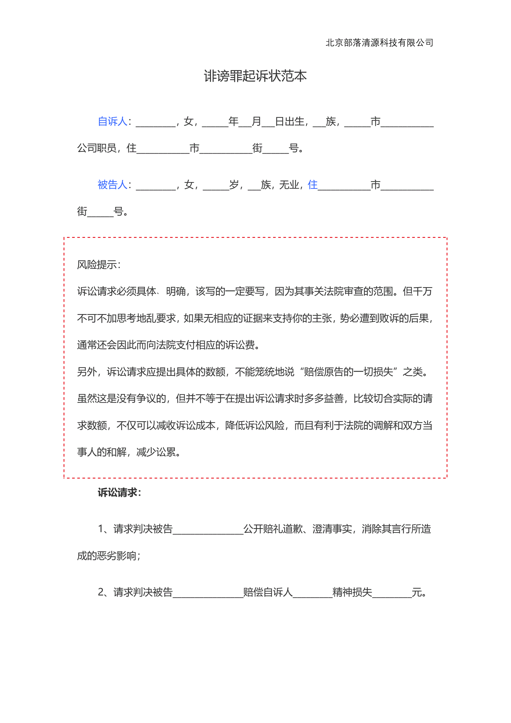 诽谤罪起诉状范本