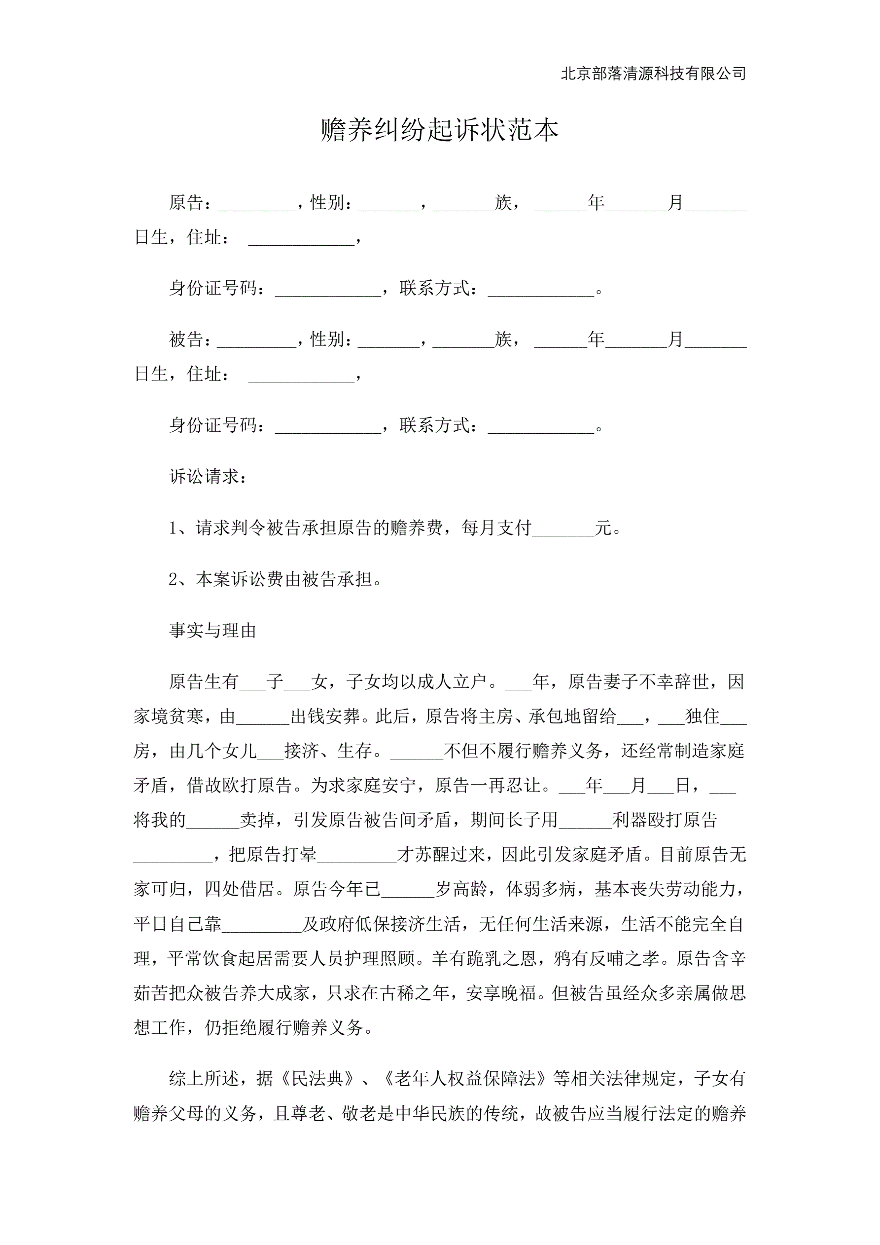 赡养纠纷起诉状范本