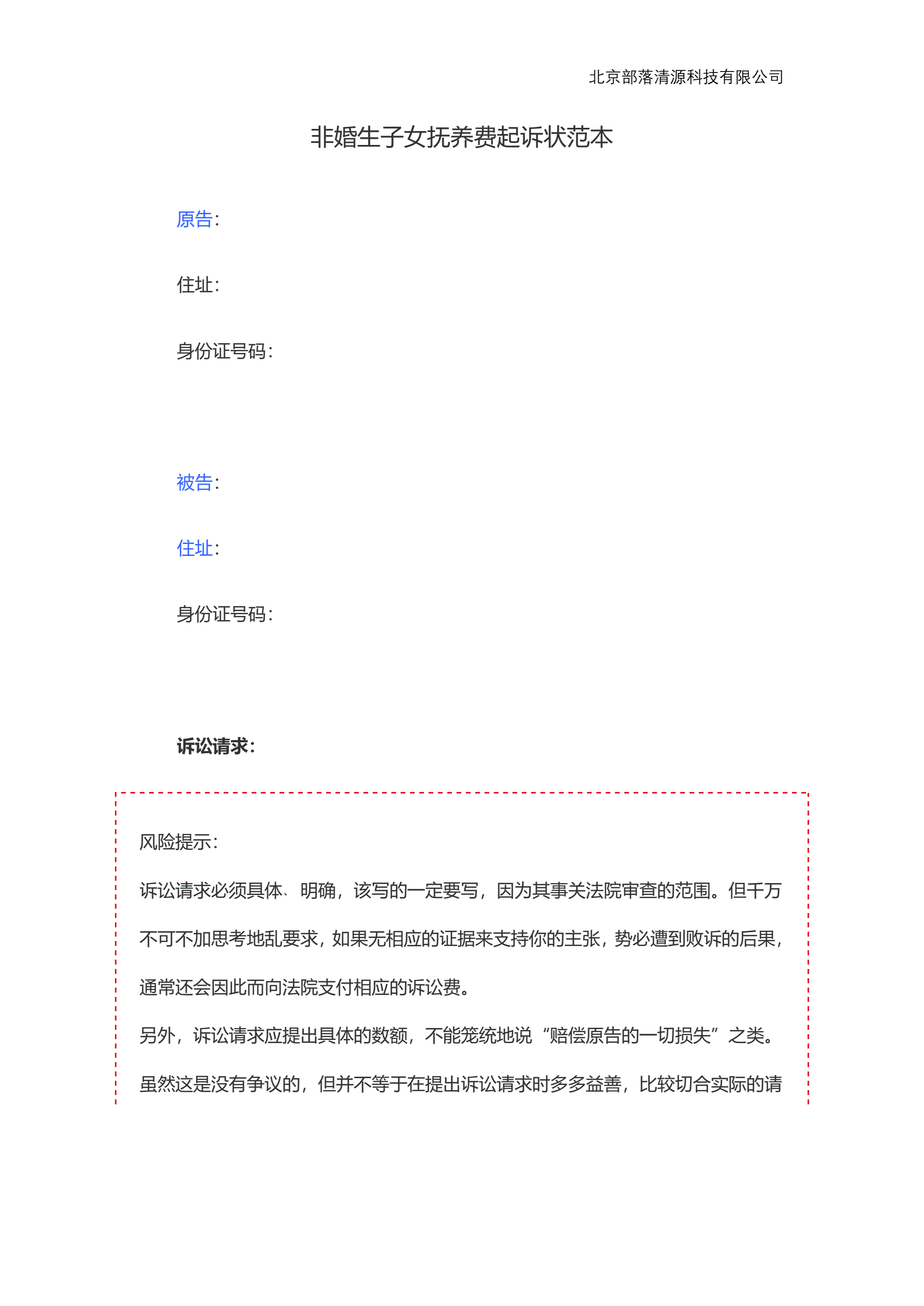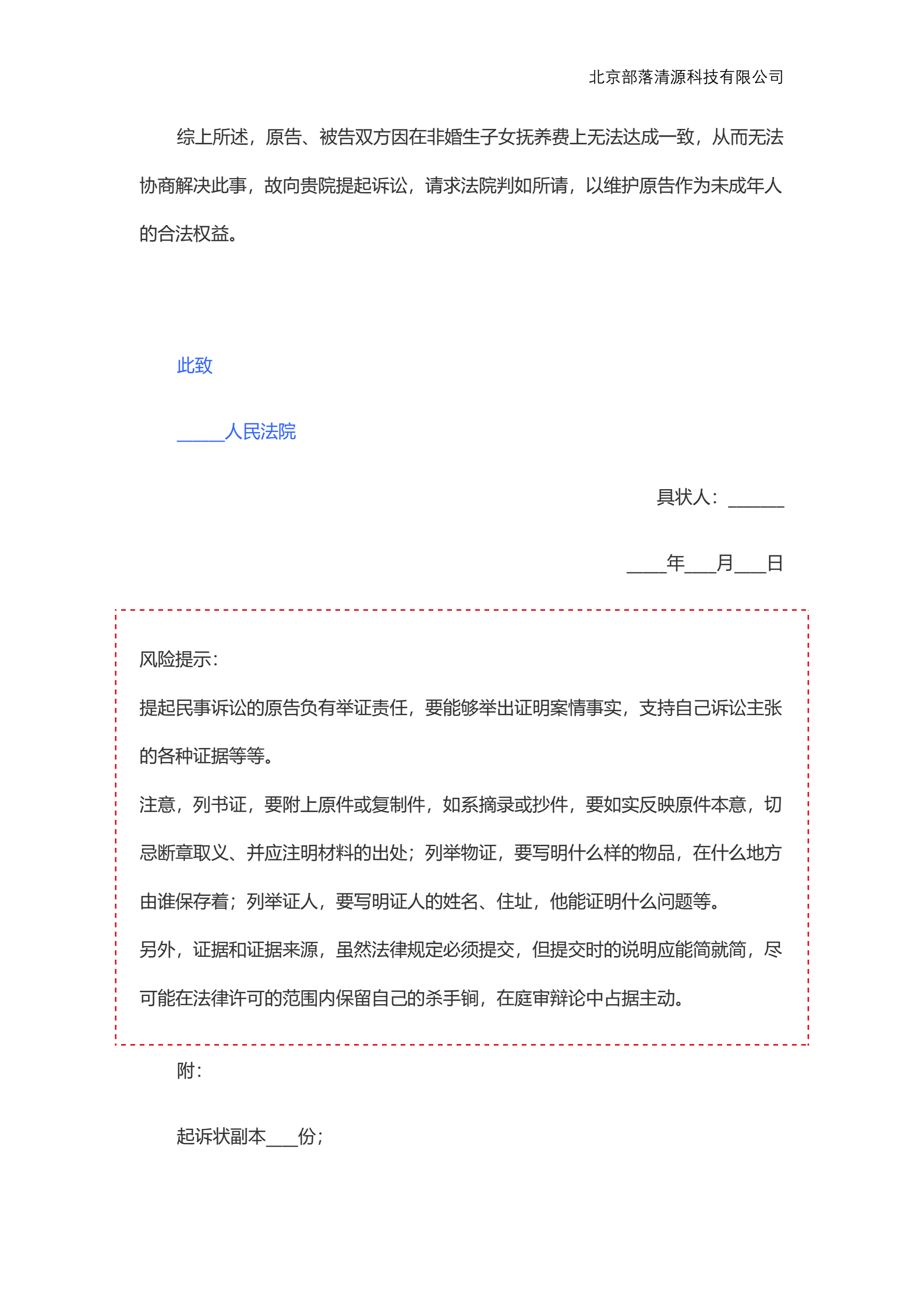 非婚生子女抚养费起诉状范本