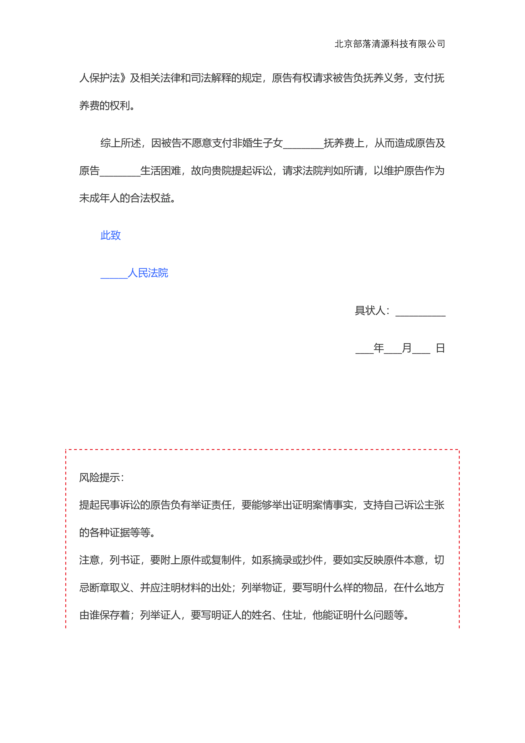 >非婚生子抚养费起诉状范本