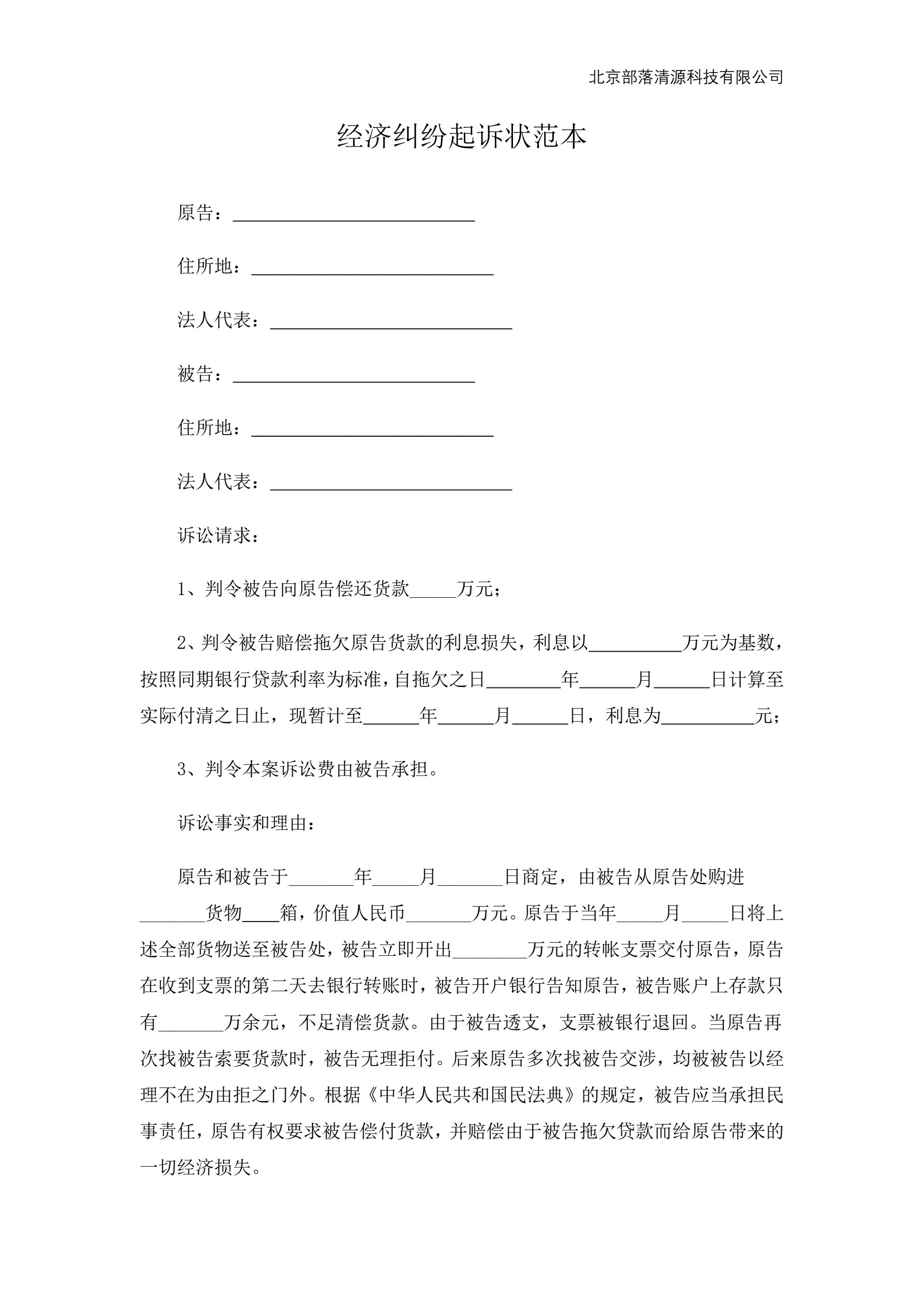 >经济纠纷起诉状范本
