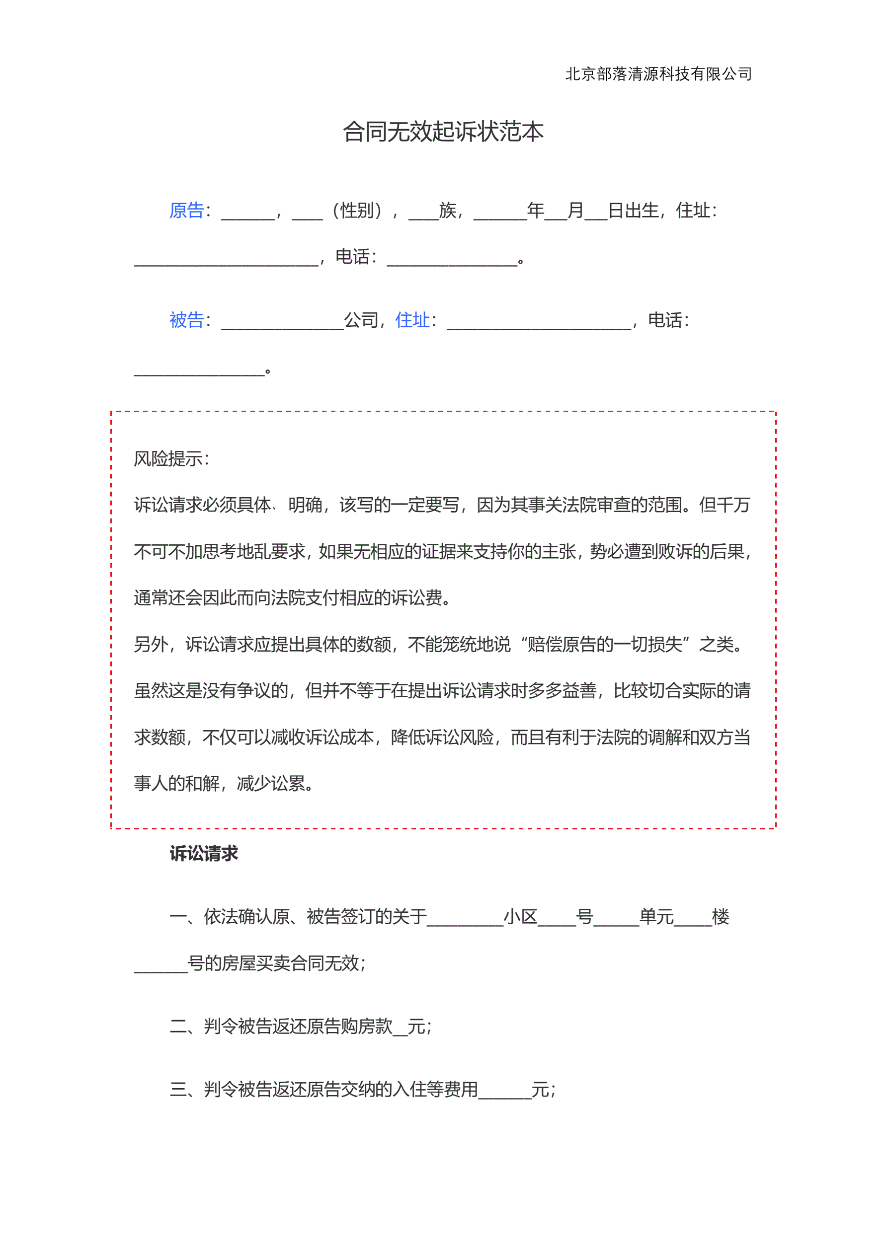 >合同无效起诉状范本