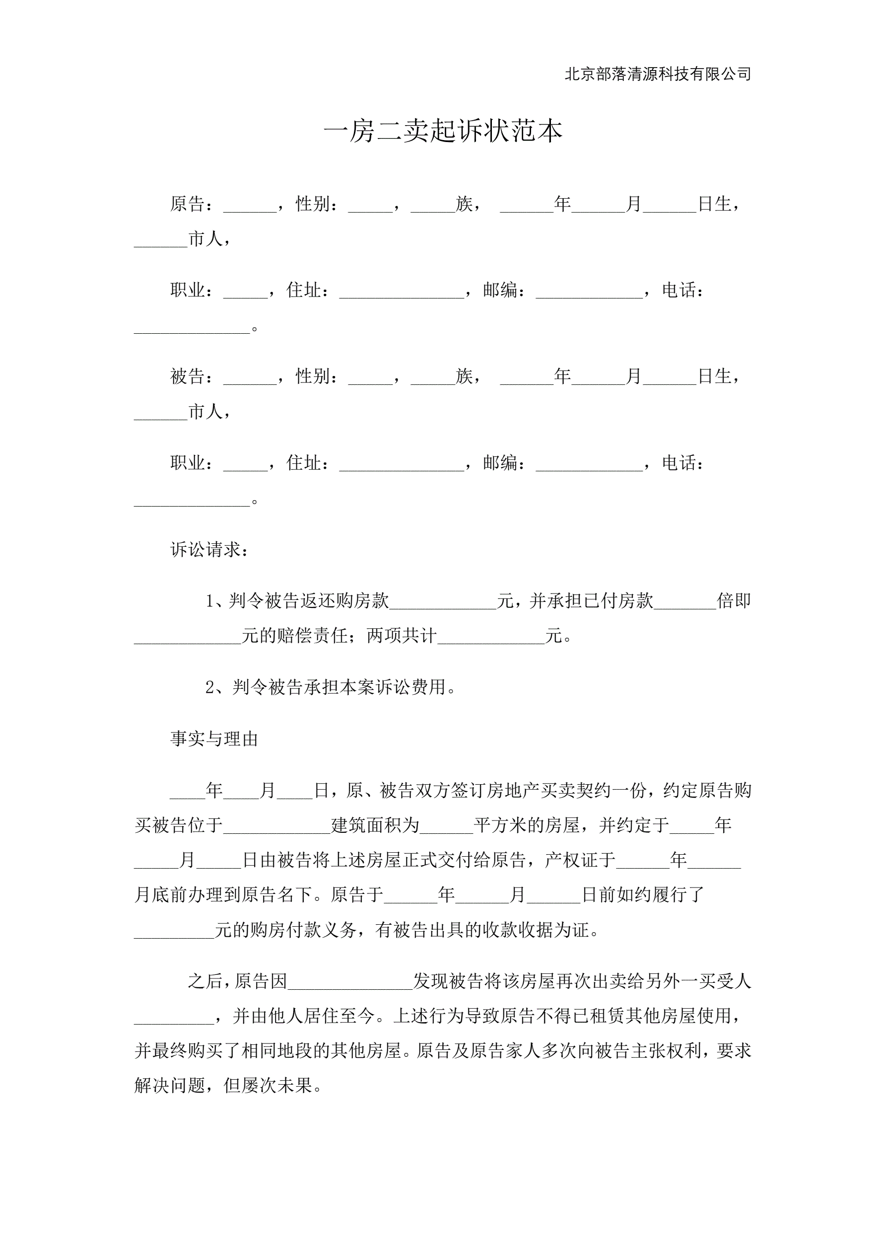 >一房二卖起诉状范本