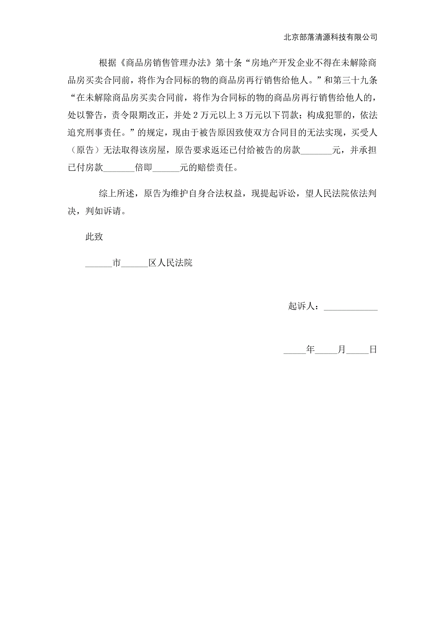 一房二卖起诉状范本