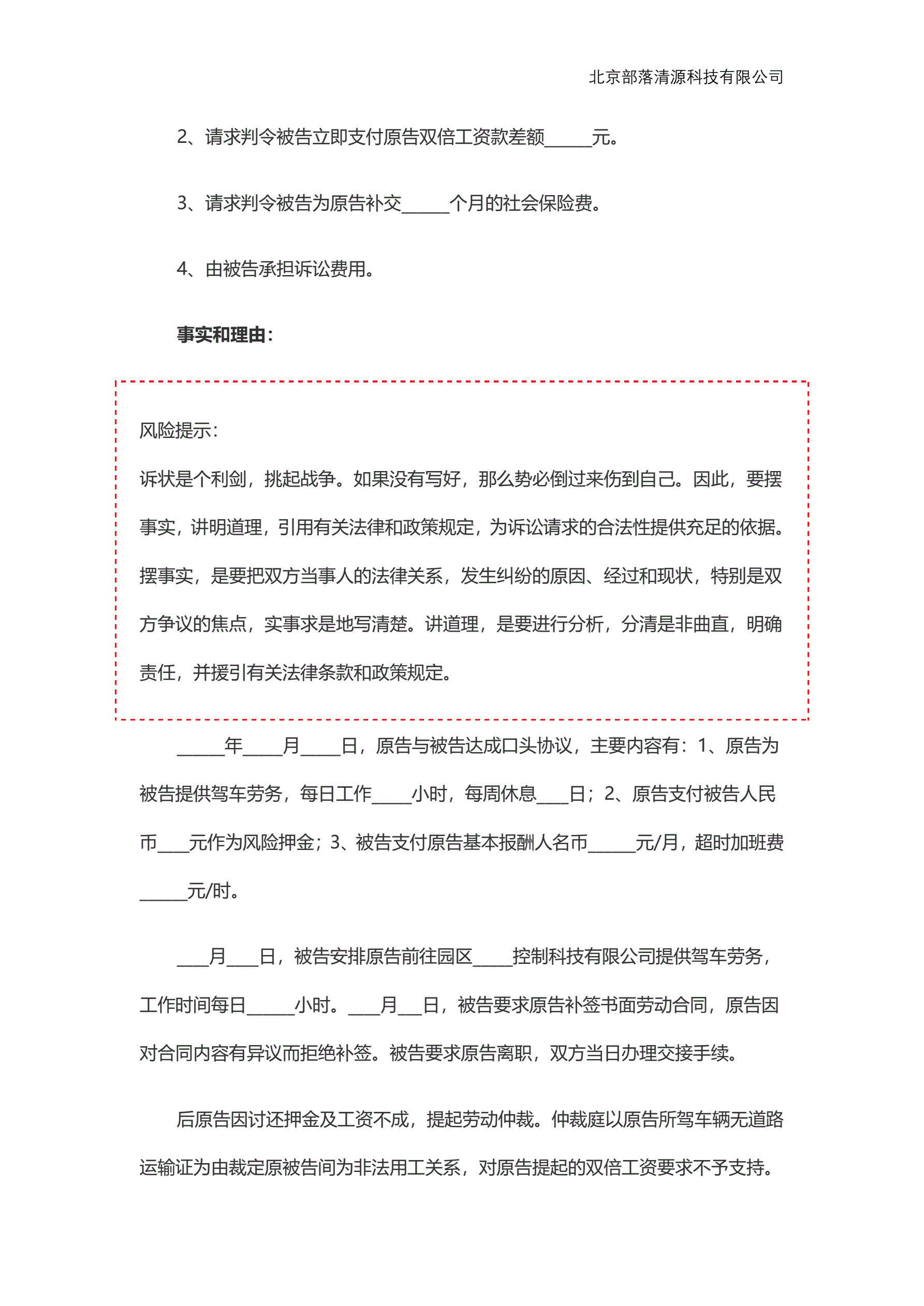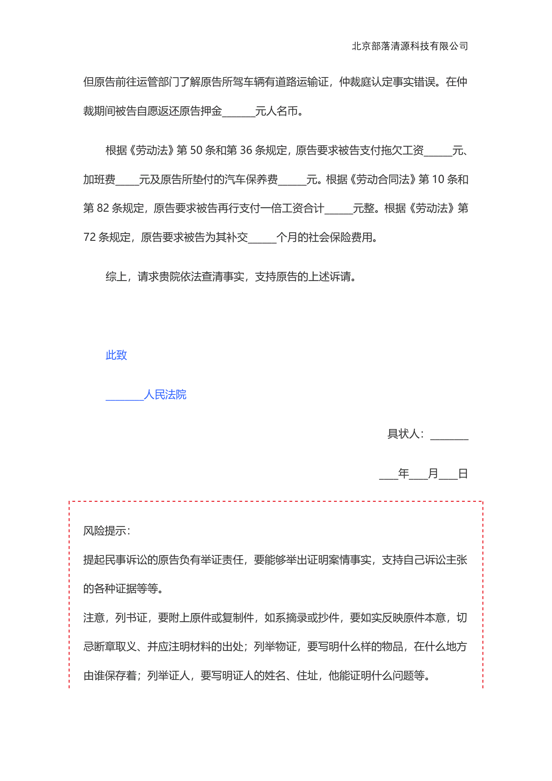 个人不服劳动仲裁起诉状范本