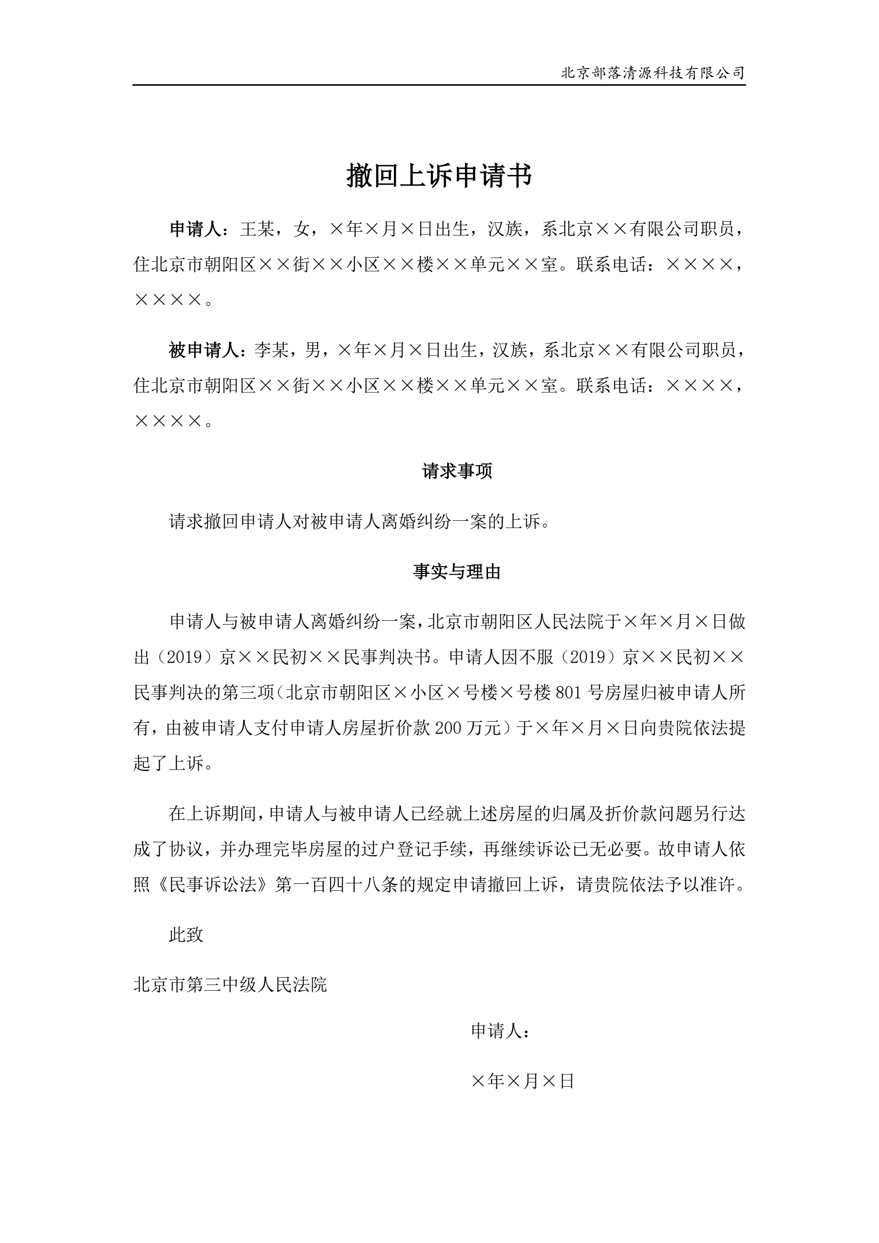 撤回上诉申请书