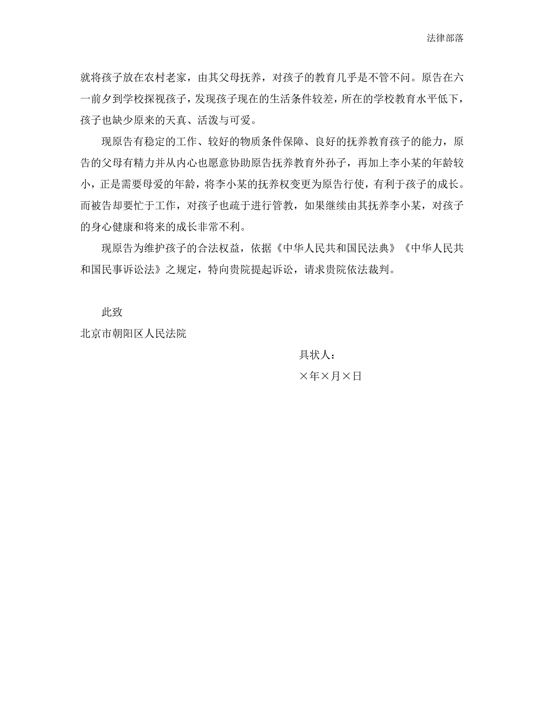 >民事起诉状(变更抚养关系纠纷)