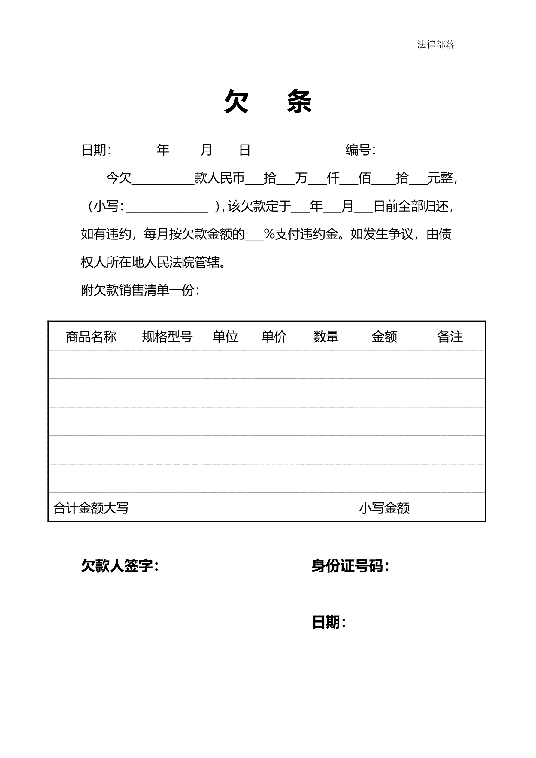 商品款欠条附带表格