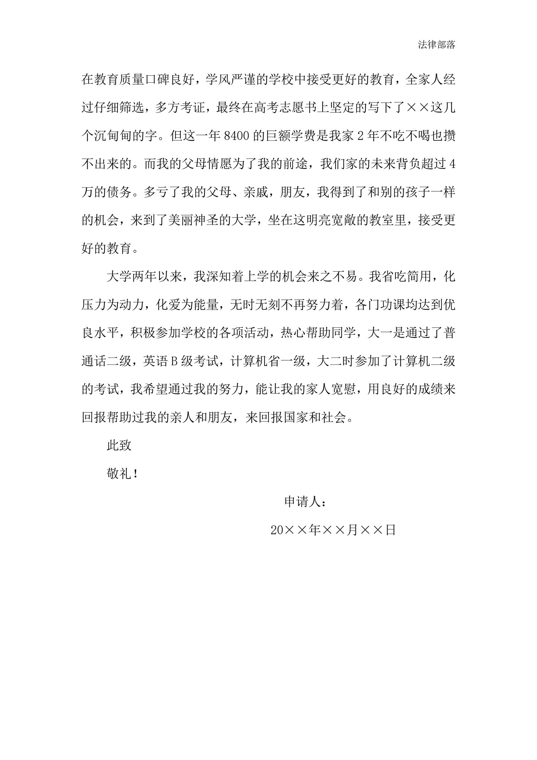 大学贫困生低保申请书范文