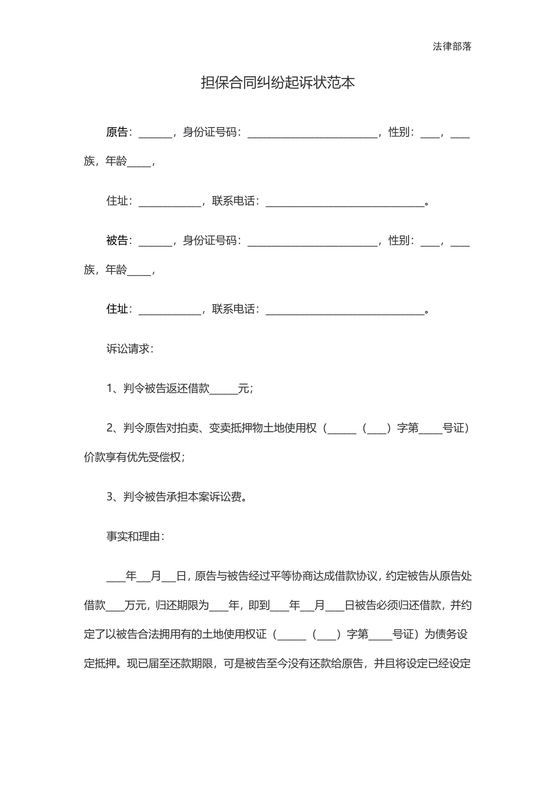 >担保合同纠纷起诉状范本
