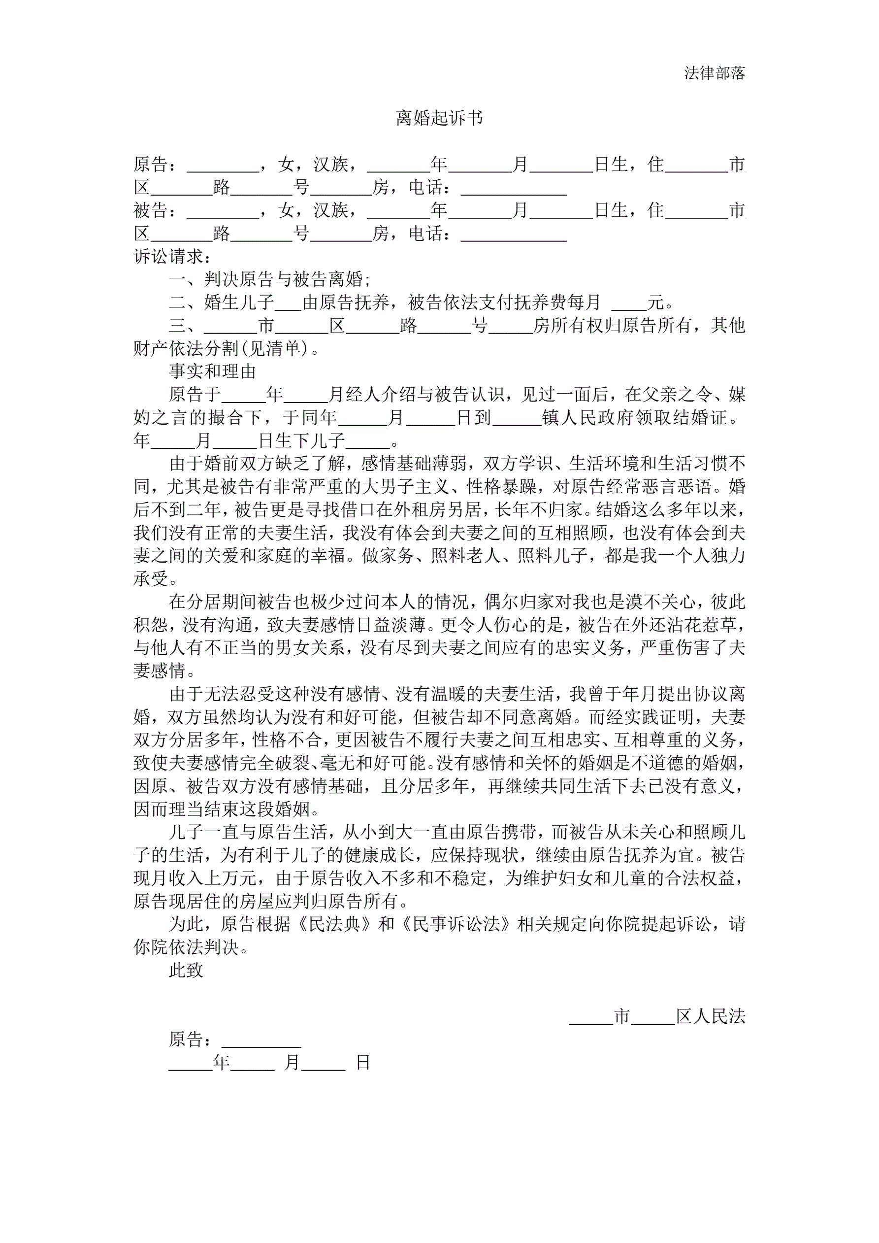 离婚起诉书范本