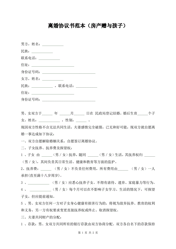 离婚协议书范本(房产赠与孩子)