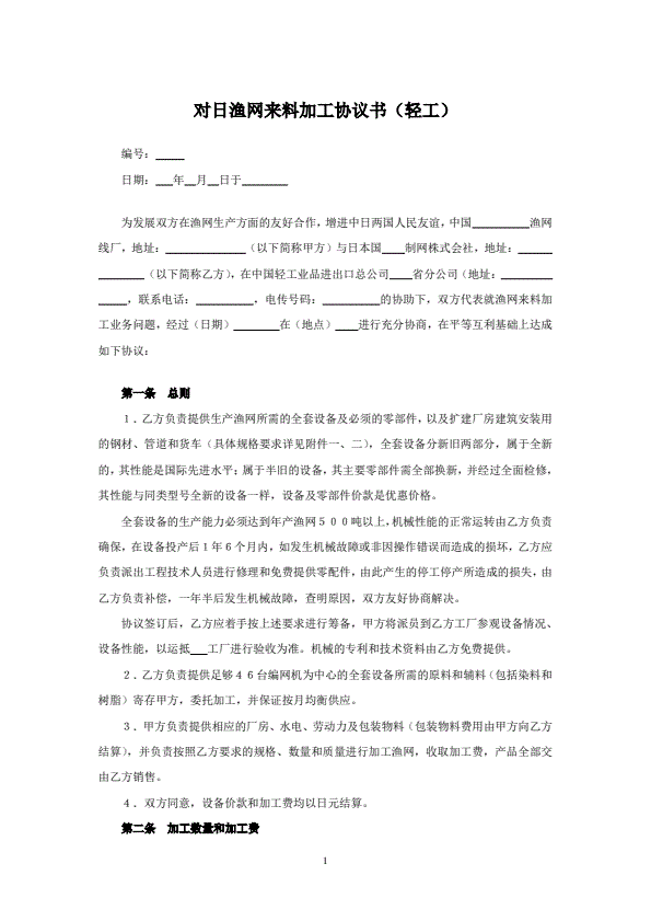 对日渔网来料加工协议书(轻工)
