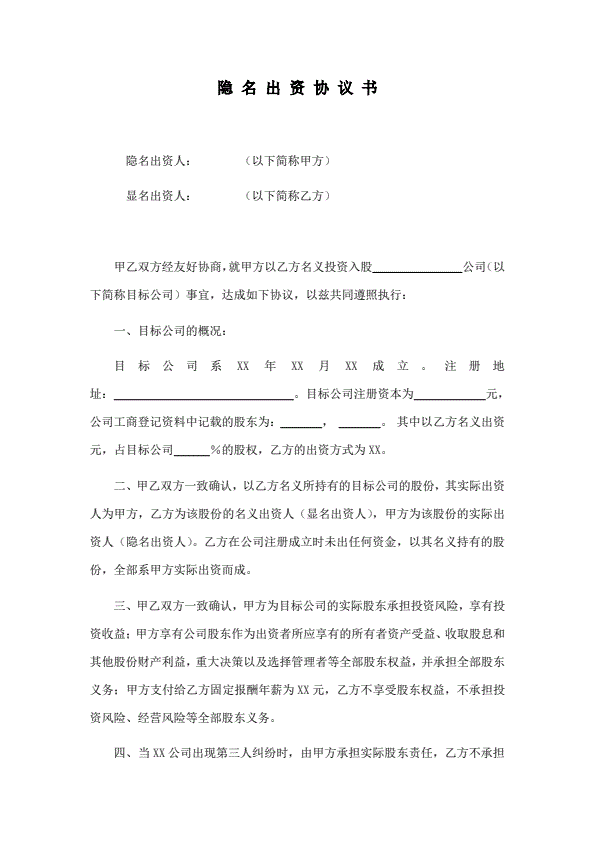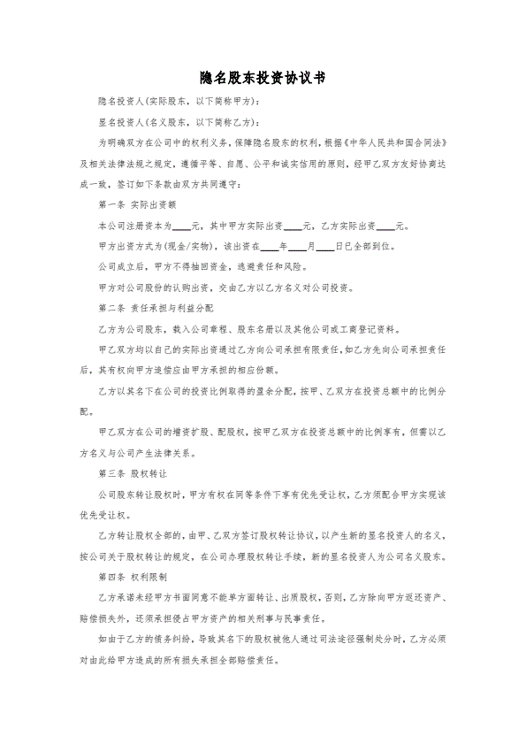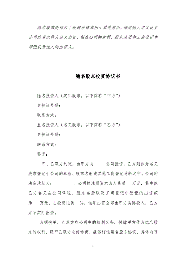 隐名股东投资协议书