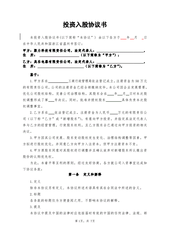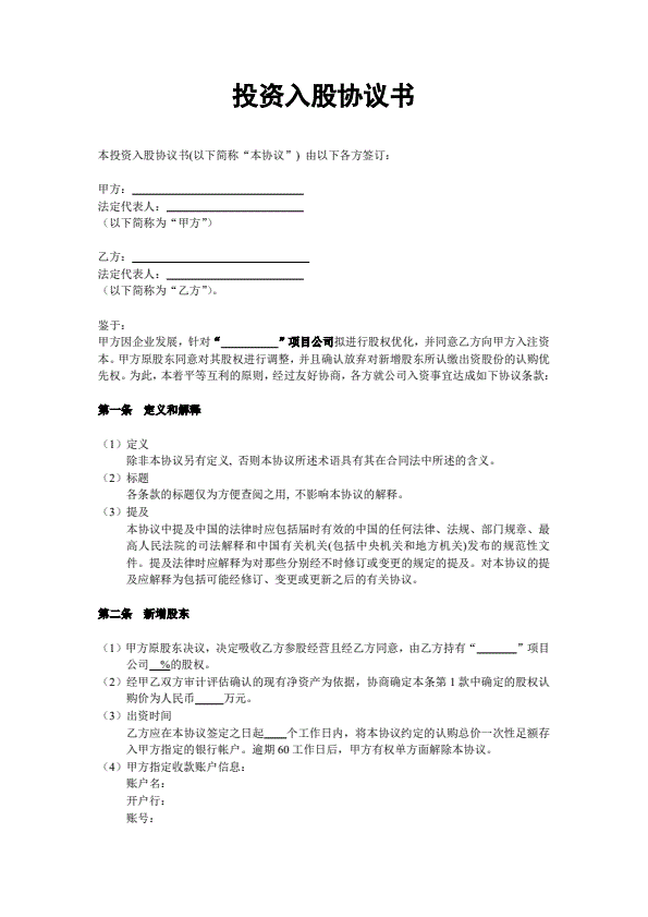 投资入股协议书(非上市公司)
