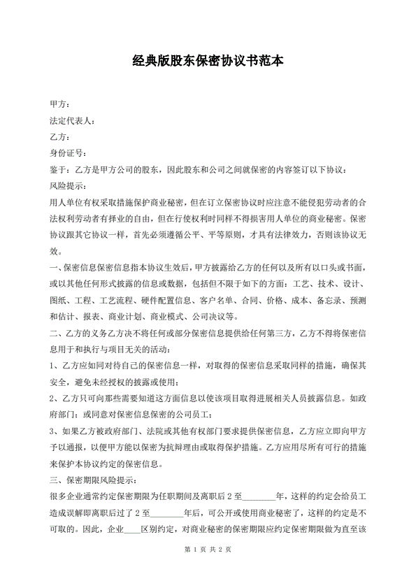 经典版股东保密协议书范本