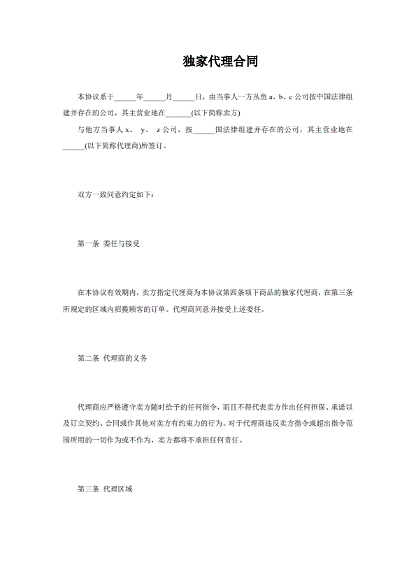 独家代理合同协议