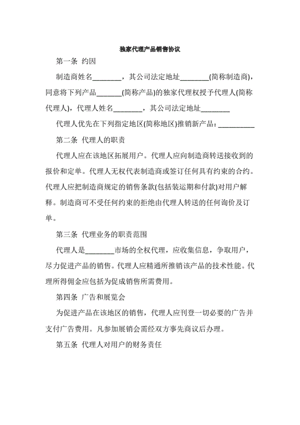 独家代理产品销售协议